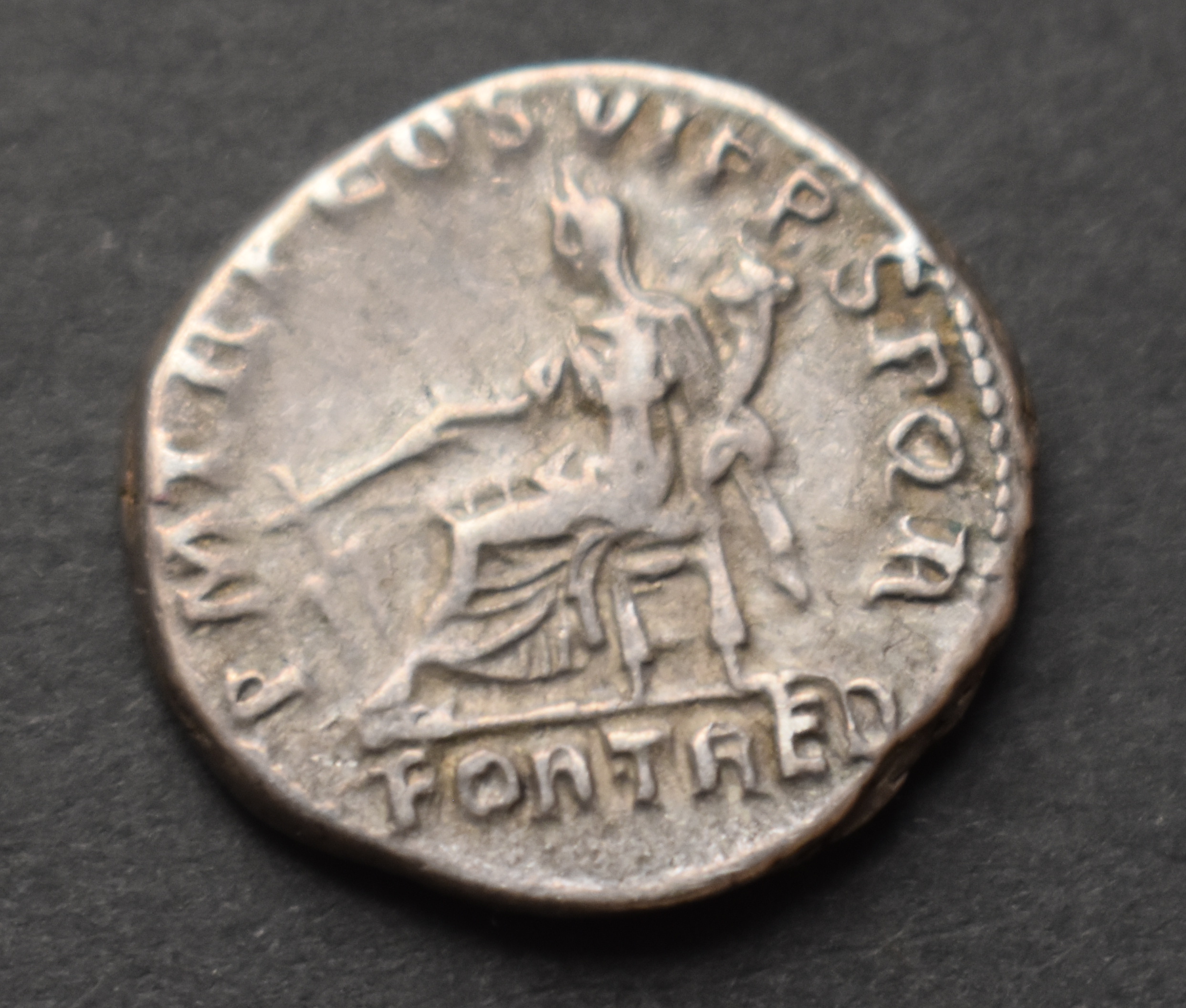 A silver denarius with Trajan (r. 98-117 CE) on the obverse side. Here on the reverse side, the inscriptions demonstrate the major achievements of the emperor. They read as such: PM-TRP-COSVI-PP-SPQR. These are abbreviations for Pontifex Maximus (the chief priest in Roman religion), Tribunicia Potestate (Tribune of the People), Consul for the 6th time, Pater Patriae (Father of the Country, a great honor bestowed upon emperors and consuls by the Roman Senate), and Senatus Populus Que Romanus, meaning the government and people of Rome.