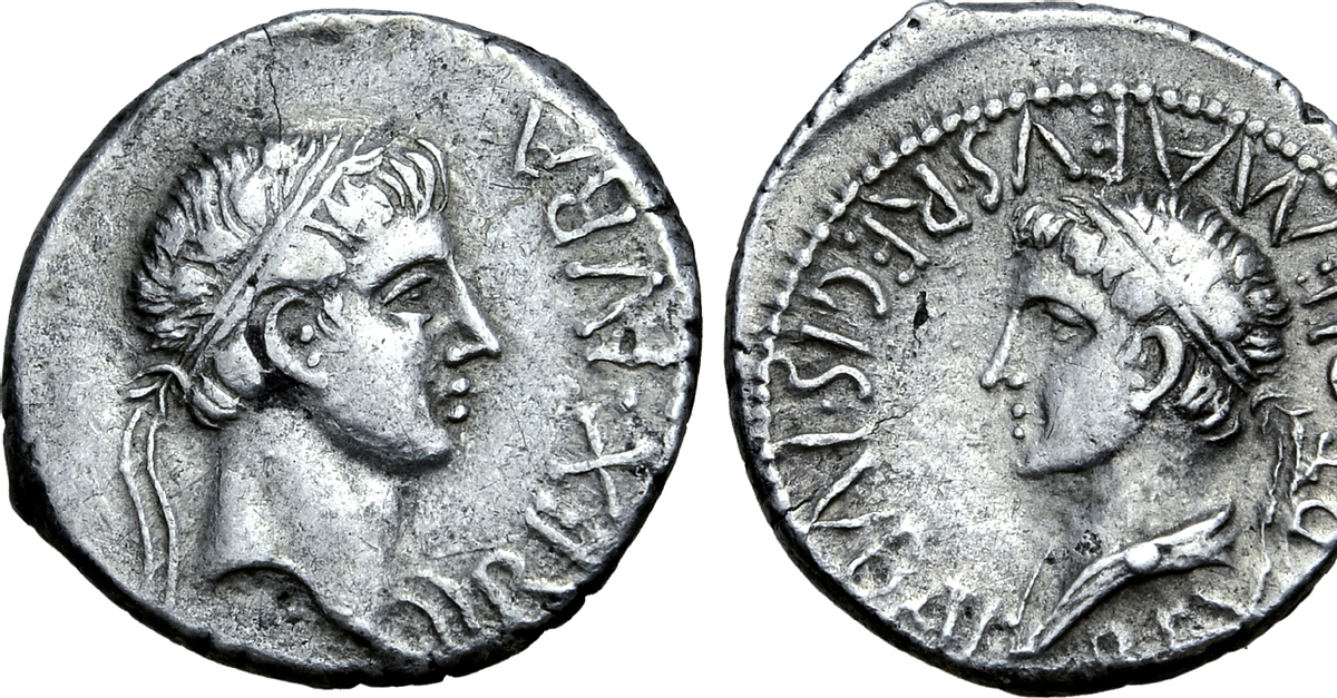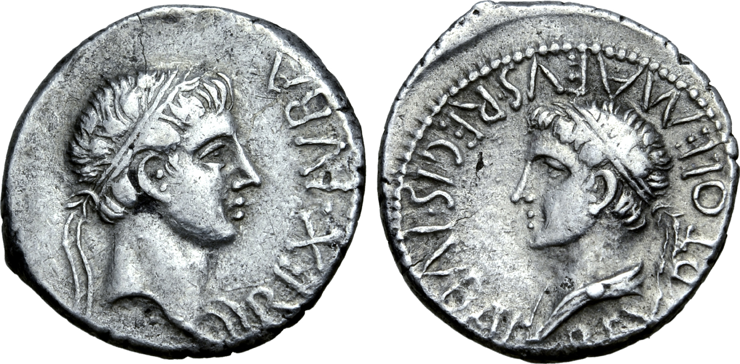 Coin from the co-regency of Juba II (r. 29 BCE - 23 CE) and Ptolemy of Mauretania (c. 10 BCE - c. 40 CE). Left; Juba II, Right; Ptolemy of Mauretania. Silver Denarius, minted c. 20-24 CE. Minted in Caesarea, Mauretania (near modern day Cherchell, Algeria). Courtesy of Roma Numismatics Ltd., Auction XVIII, 29-09-2019, Lot 519.