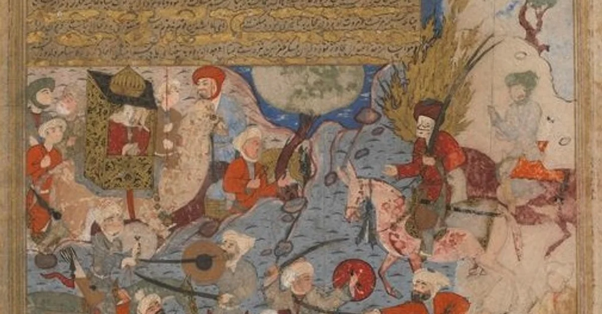 A painting from manuscript of the "Rawdat al-safa" (Persian for "Gardens of Purity") made in Iran c. 1571 - 1572 CE. The painting depicts Ali (r. 656 - 661 CE) and Aisha (c. 613 - 678 CE), who led the opposing factions at the Battle of the Camel in 656 CE. From the Freer Gallery of Art and Arthur M. Sackler Gallery of the Smithsonian Institution, Washington, D.C. The Rawdat al-safa was originally authored in 1497 CE.