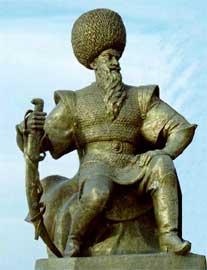 A photo of the monument to Alp Arslan, part of the Independence Monument in Ashgabat, Turkmenistan. Alp Arslan was the Sultan of the Seljuk Empire from 1063 - 1072 CE.