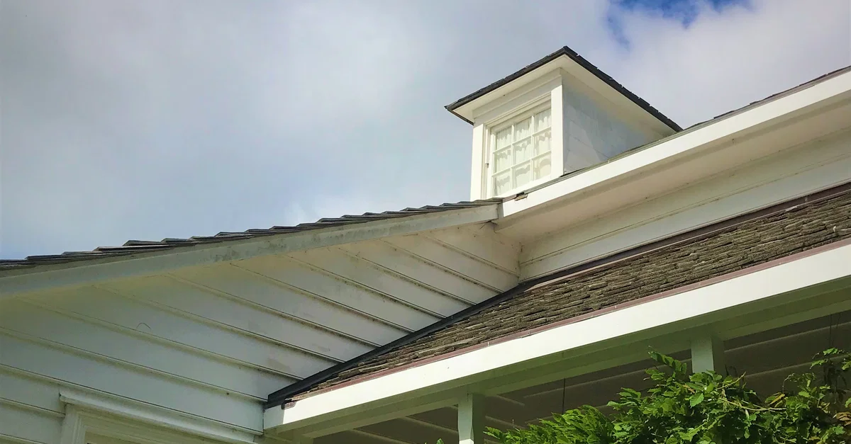 Three houses of similar design were originally constructed at the Te Waimate Mission in the Bay of Islands, New Zealand. This is the only house still standing on the site and it was built in 1832 CE. The photo is a close-up view of the low-pitched hipped roof, and one of the three small dormer windows. This photo was taken in November 2019.