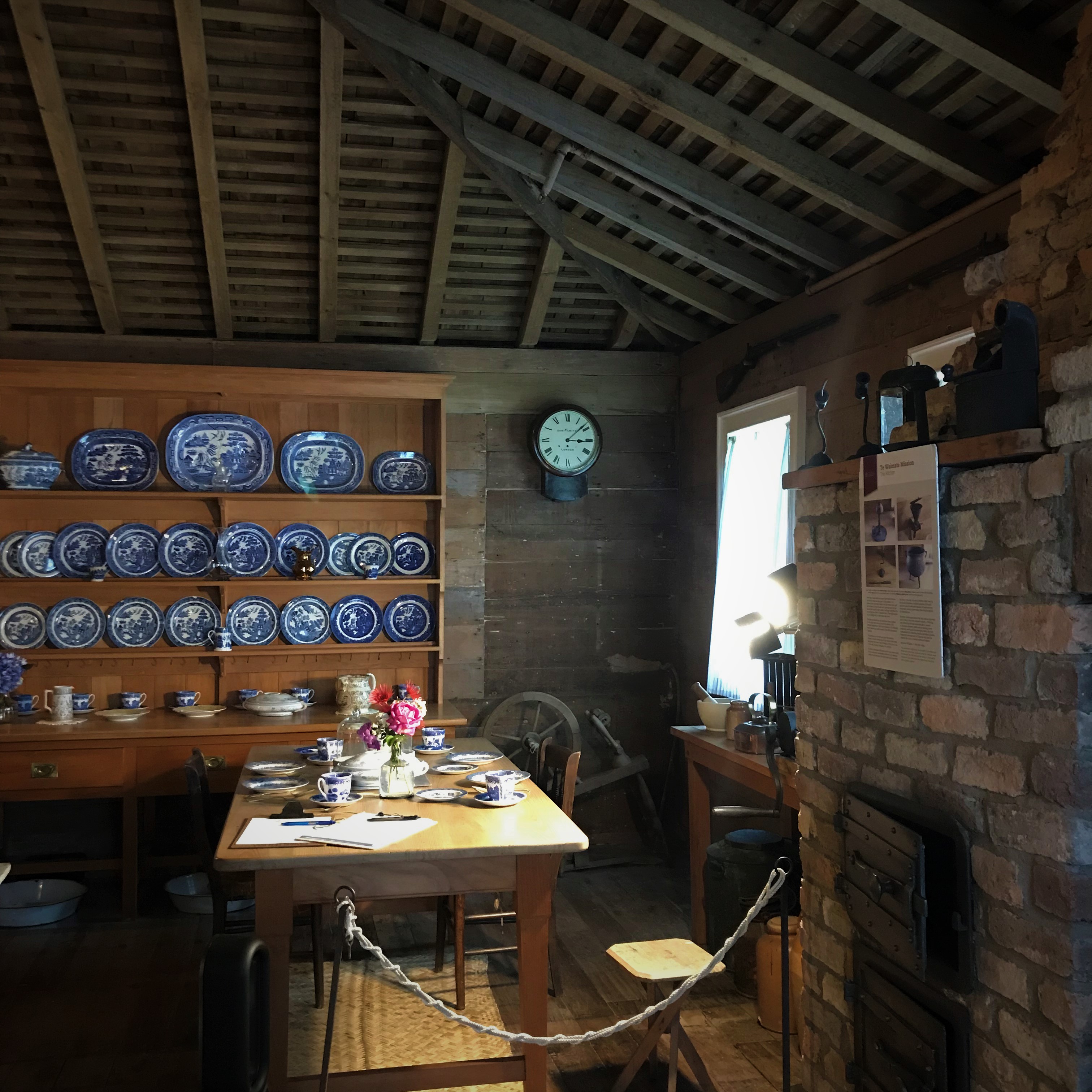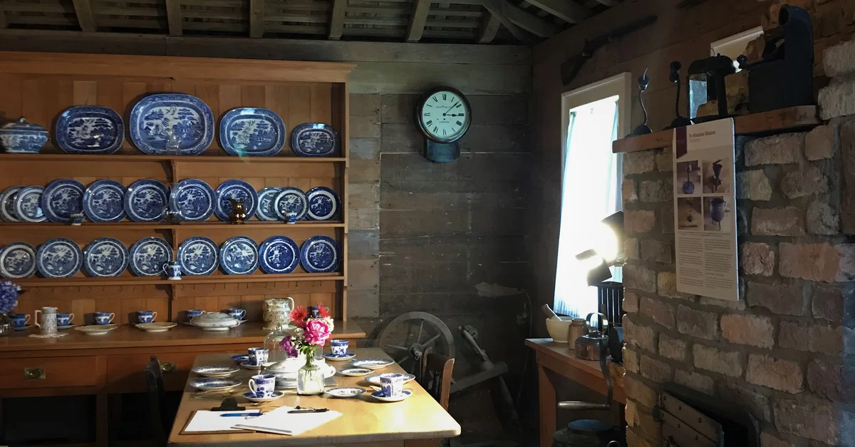 Three houses of similar design were originally constructed in 1832 CE at the Te Waimate Mission in the Bay of Islands, New Zealand. Only one house remains on site. This photo shows the dining area in one of the two main rooms on either side of a central entrance hall in that mission house. Porcelain from that time period is also on display. This photo was taken in November 2019.