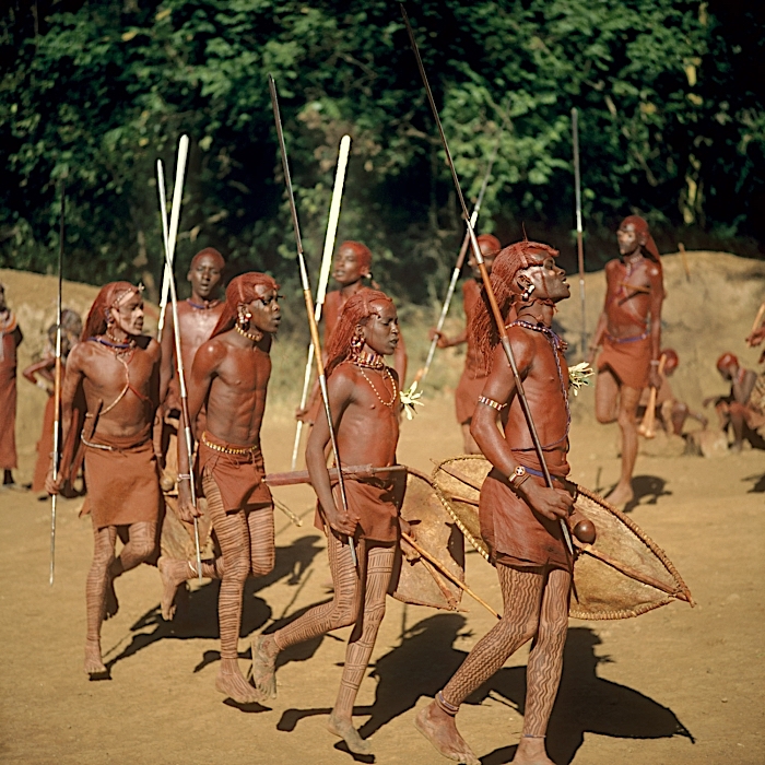 A group of Maasai warriors. The Maasai people have occupied East Africa, particularly southern Kenya and northern Tanzania since the 16th-17th century CE. (Photograph taken in 1973, Wereld Museum Collection, Rotterdam)