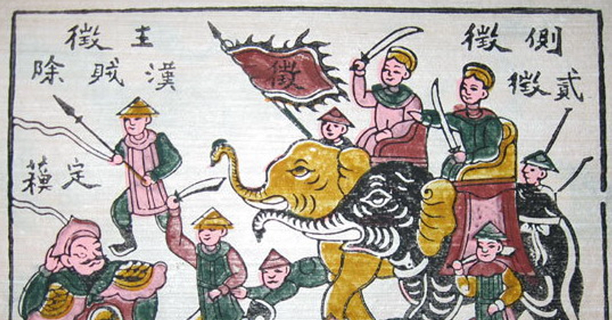 A painting of the Trung Sisters (c. 12 - 43 CE), Trung Trac and Trung Nhi, during their revolt against Chinese Han Dynasty in 40 CE. The Trung Sisters are frequently depicted atop war elephants in battle, as in this painting.