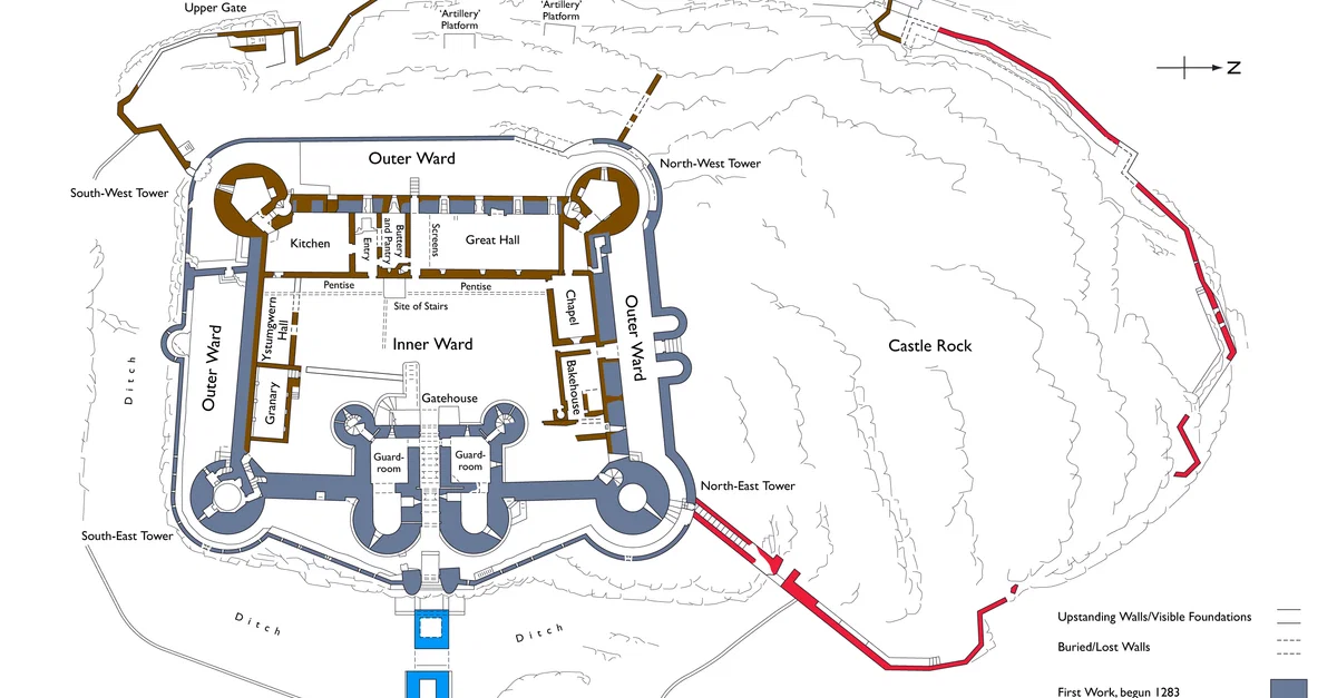 A plan of Harlech Castle in Wales, first built by Edward I of England (r. 1272-1307 CE) from 1283 CE and completed by 1330 CE.