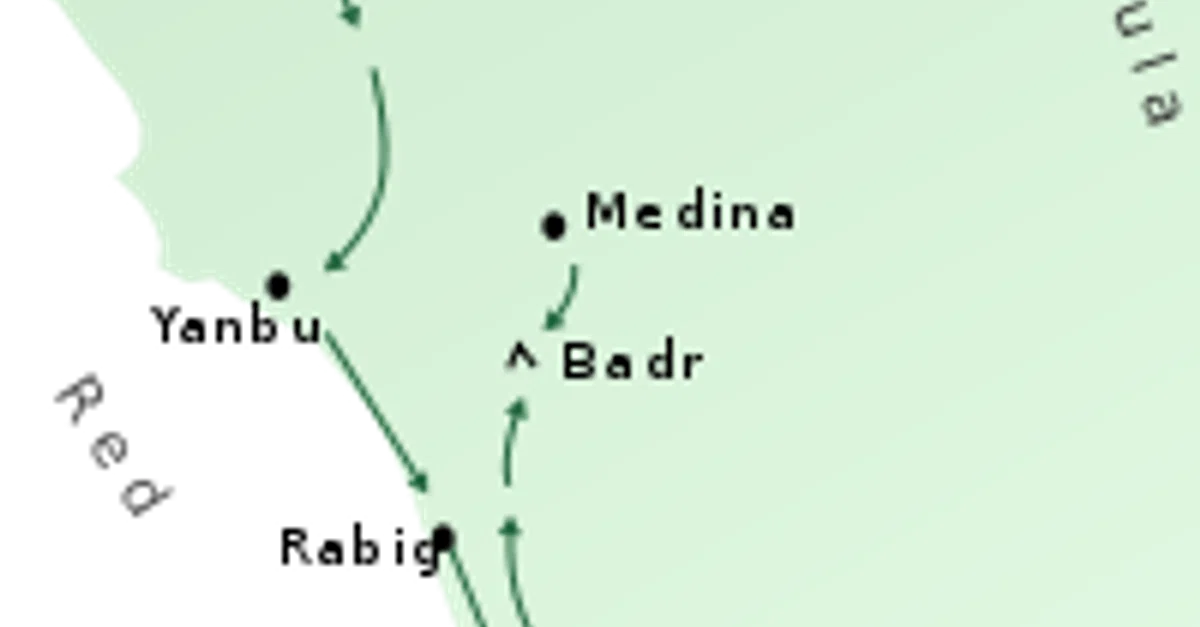 A map of the troop movements which led to the Battle of Badr, in 624 CE. This map details the movements of the Meccan caravan from Syria, the Muslim raiding party which pursued it, and the Meccan relief force which intercepted the Muslims at Badr. When the Meccan relief force met the Muslim raiding party at Badr it resulted in a decisive Muslim victory.