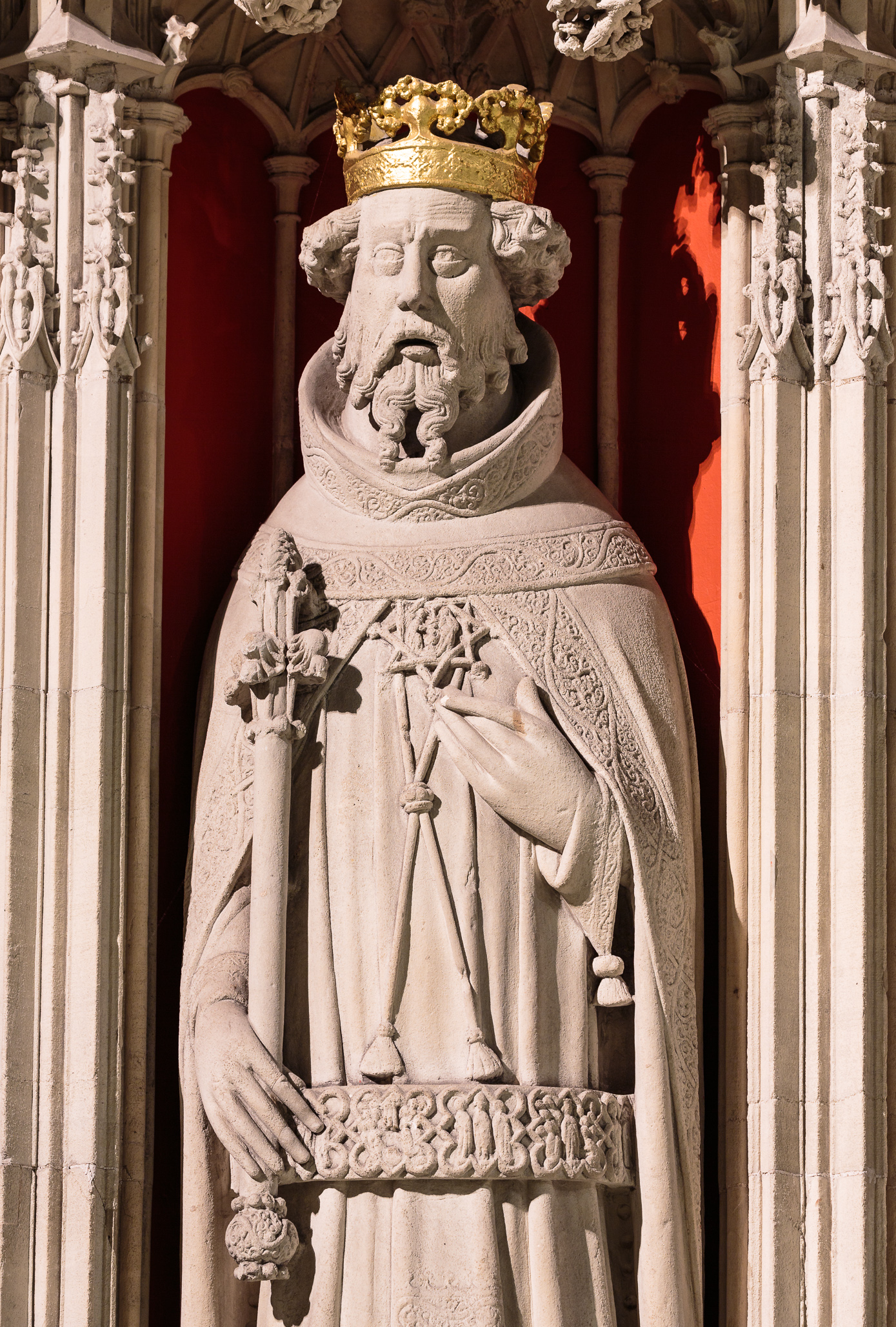 Sculpture of King Henry I of England (r. 1100 - 1135 CE) from the Quire's Screen (also known as the Choir's Screen or the King's Screen) in York Minster. The Screen was created in the 15th Century CE, and portrays every English king from William the Conqueror (c. 1027 - 1087 CE) to Henry VI of England (1421 - 1471 CE).