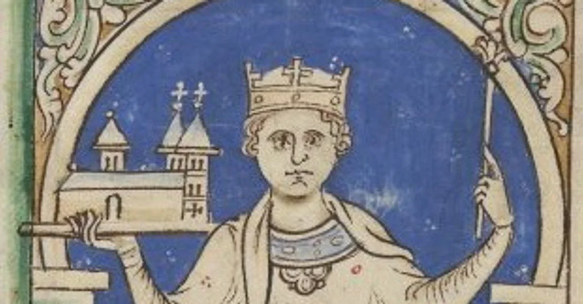King Stephen of England (r. 1135 - 1154 CE), depicted in a folio from an English manuscript dated c. 1250-1259 CE. Royal 14 C VII f. 8v, British Library.