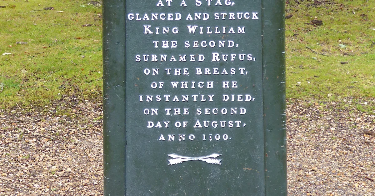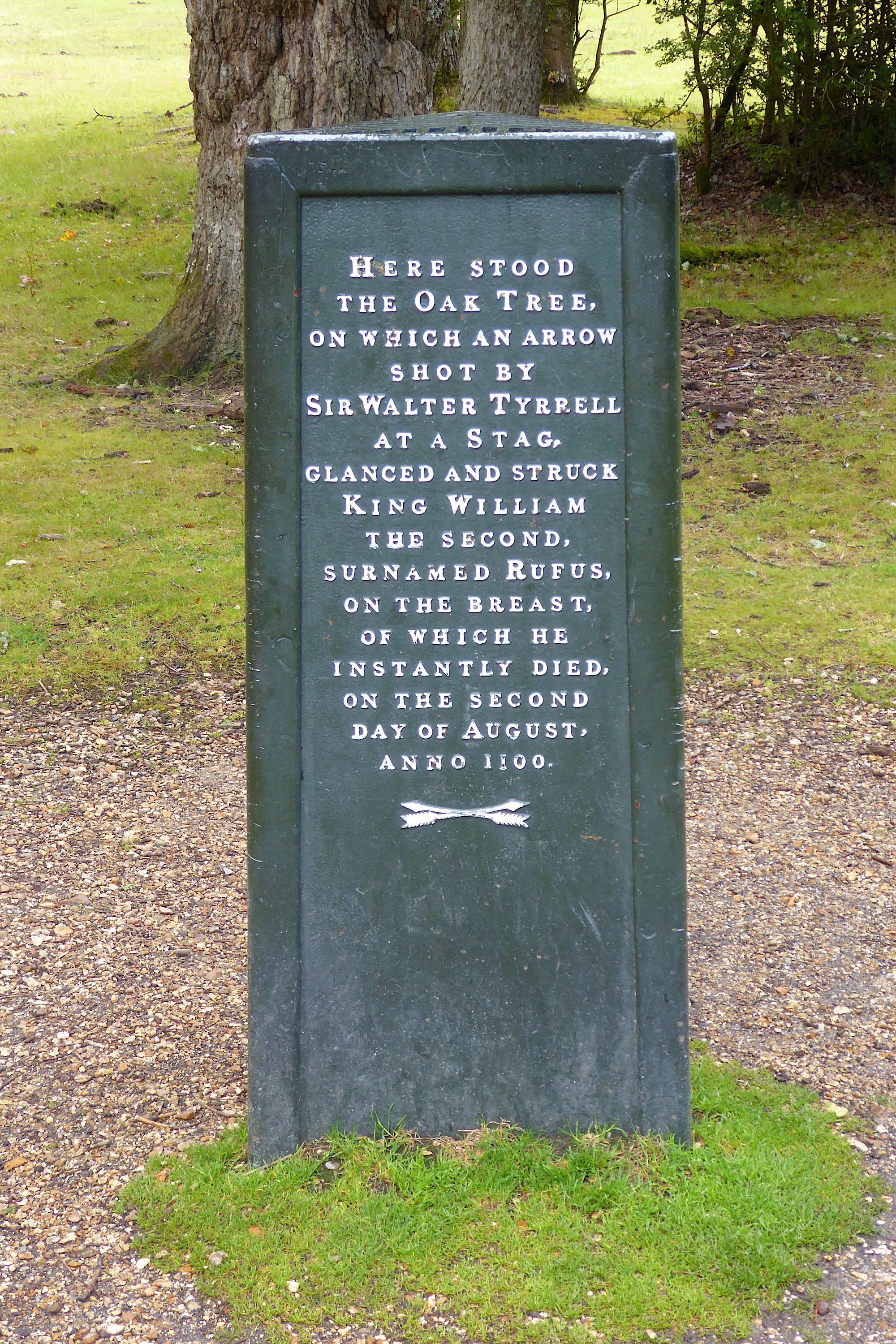 The Rufus stone (now a metal plaque) which marks the spot in the New Forest, England where William II of England (r. 1087-1100 CE) died in a hunting accident.