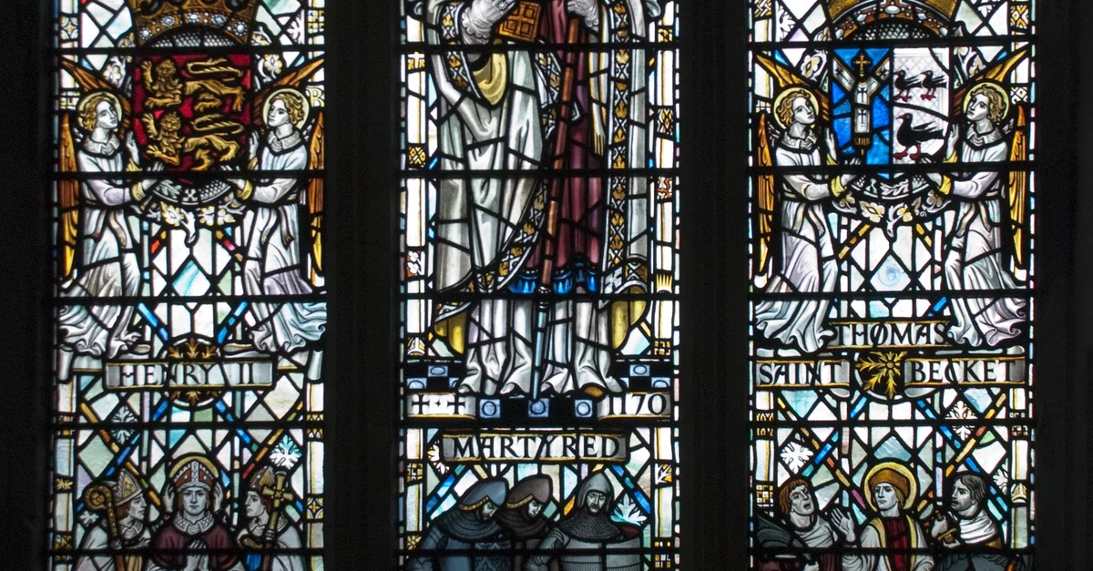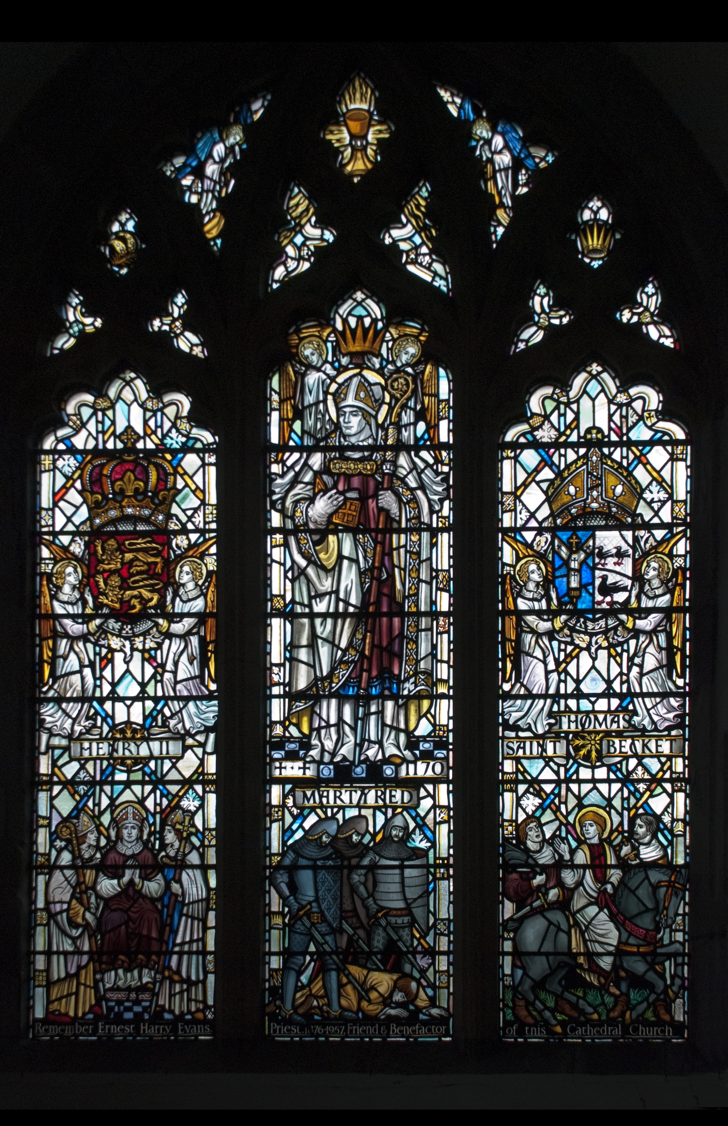 A stained glass window from St. David's Cathedral in Pembrokeshire, Wales. The composition is divided into three scenes. On the right, bottom register is Henry II of England (r. 1154 - 1189 CE), seated. The coat of arms of Henry II is depicted in the top right register. In the center, top register is St. Thomas Becket of Canterbury (1119 - 1170 CE), while Thomas Becket's martyrdom is depicted in the bottom center register. Finally, on the bottom left register is St. Thomas Becket riding, while the coat of arms of Thomas Becket is depicted above on the top left register.