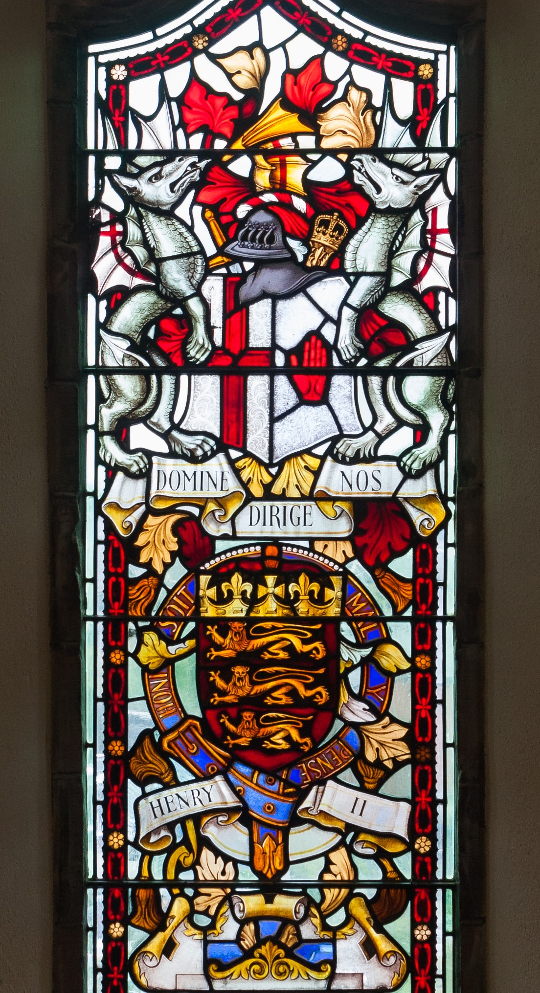 A stained glass window depicting the coat of arms of Henry II of England (r. 1154 - 1189 CE). From the Guildhall in Derry, Northern Ireland. The window was was manufactured by Campbell Brothers in Belfast on behalf of the Worshipful Company of Mercers who presented it to the city of Londonderry in 1912 CE. The stained glass window was destroyed by a bombing in 1972 CE, and was subsequently restored by Calderwood Glass, Newtownabbey.