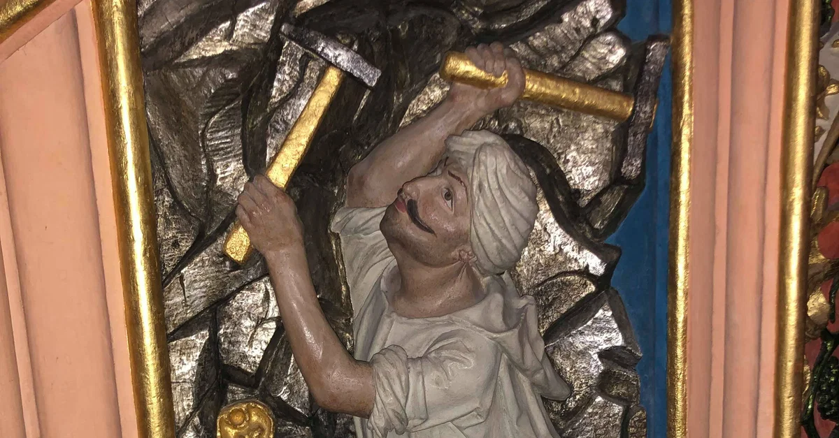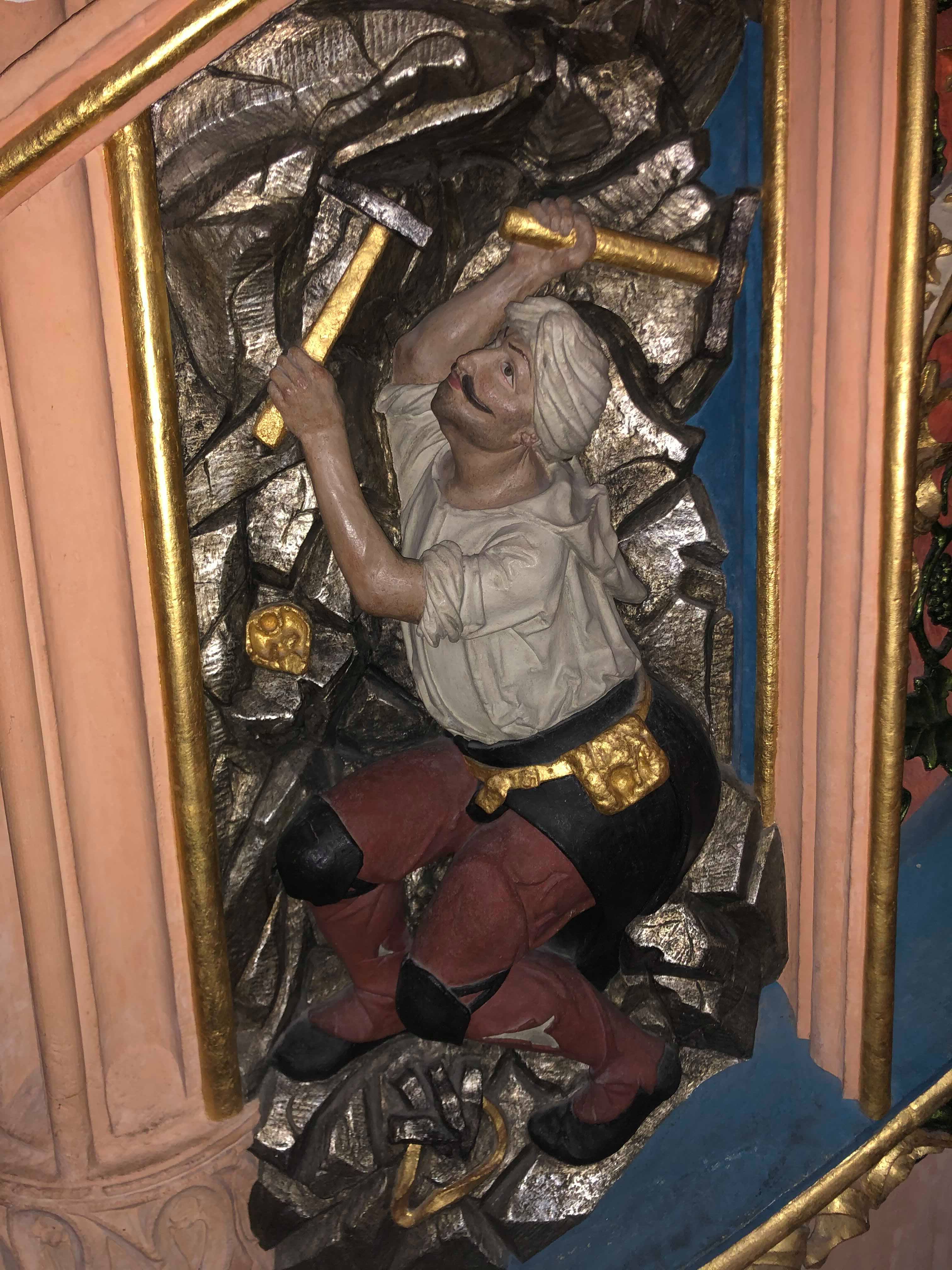 The miner depicted at the pulpit of St. Anne's church In Annaberg-Bucholtz. The Church was constructed around 1500 CE, and the pulpit dates from the same time. The pulpit was sculptured by Franz Maidburg (1480- 1533 CE).