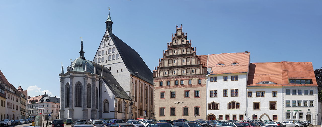 The Untermarkt (Under Market) in Freiberg. Visible is both the Museum Freiberg and the Freiberg Cathedral, also known as St. Mary's Cathedral. Notable is also the gothic patrician houses with very high and steep pitched roof constructions.
