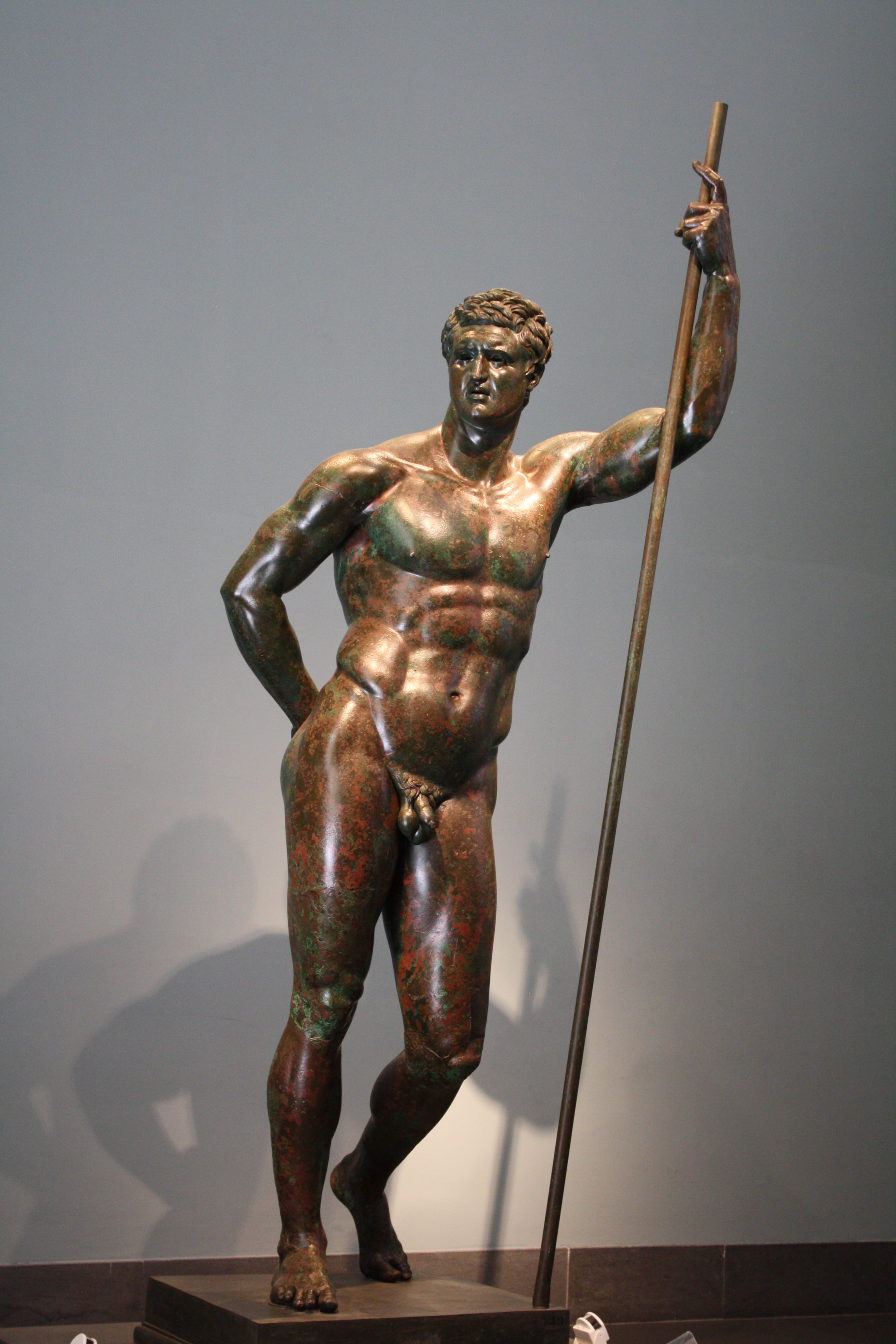 The 2nd century BCE bronze statue known as 'The Hellenistic Prince'. The statue perhaps represents Attalus II, king of Pergamon. The head may also be a portrait of an unknown wealthy Roman, eager to appear as a Hellenistic prince. The work is influenced by the 4th century BCE sculpture of Alexander by Lysippus and is one of the very rare examples of bronze Hellenistic sculpture. The statue is cast by the lost-wax technique and the figure holds a spear in his right hand. Provenance: the Quirinal, Rome. (Palazzo Massimo, Rome).