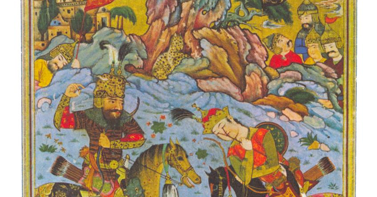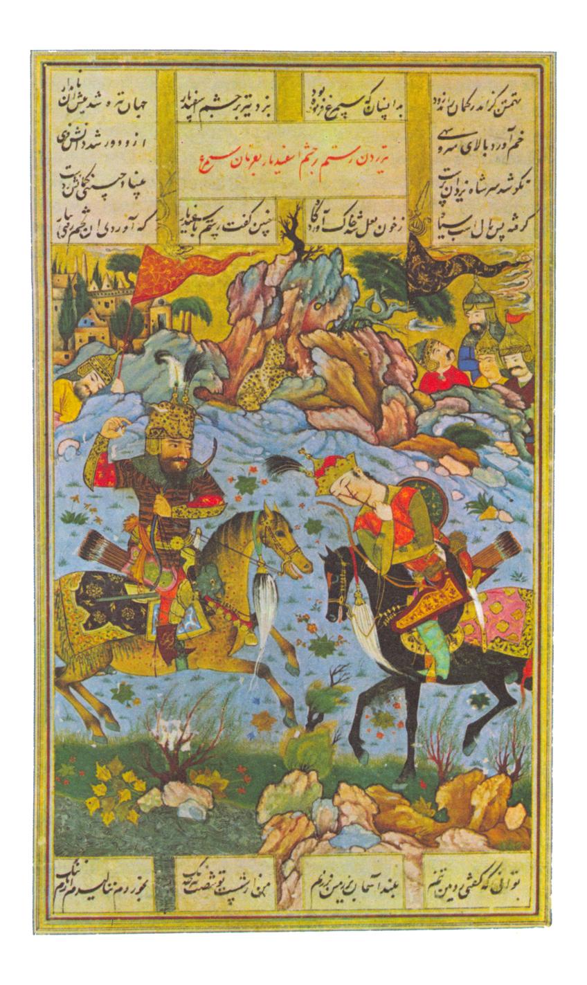 Scene from Shahnameh: Rustam (or Rustum) shoots Isfandiyar in the eyes with a double-pointed arrow, from manuscript Ms. or. fol. 4251, Berlin State Library
