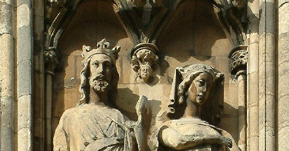 A pair of statues thought to depict Edward I of England (r. 1272 - 1307 CE) and Eleanor of Castile (1241 - 1290 CE). The statues are part of the outside of the Lincoln Cathedral in England. They may not have originally depicted Edward I and Eleanor, and were altered during a 19th Century CE restoration.