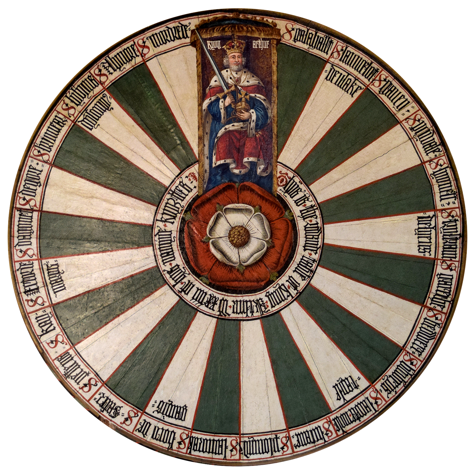 A round table hanging in Winchester Castle, made in the style of the legendary King Arthur's table. The table from Winchester was originally created in the 13th Century CE during the reign of Edward I of England (r. 1272 - 1307 CE). The table was repainted in the reign of Henry VIII of England (r. 1509 - 1547 CE), and the figure of King Arthur is modeled after Henry VIII.
