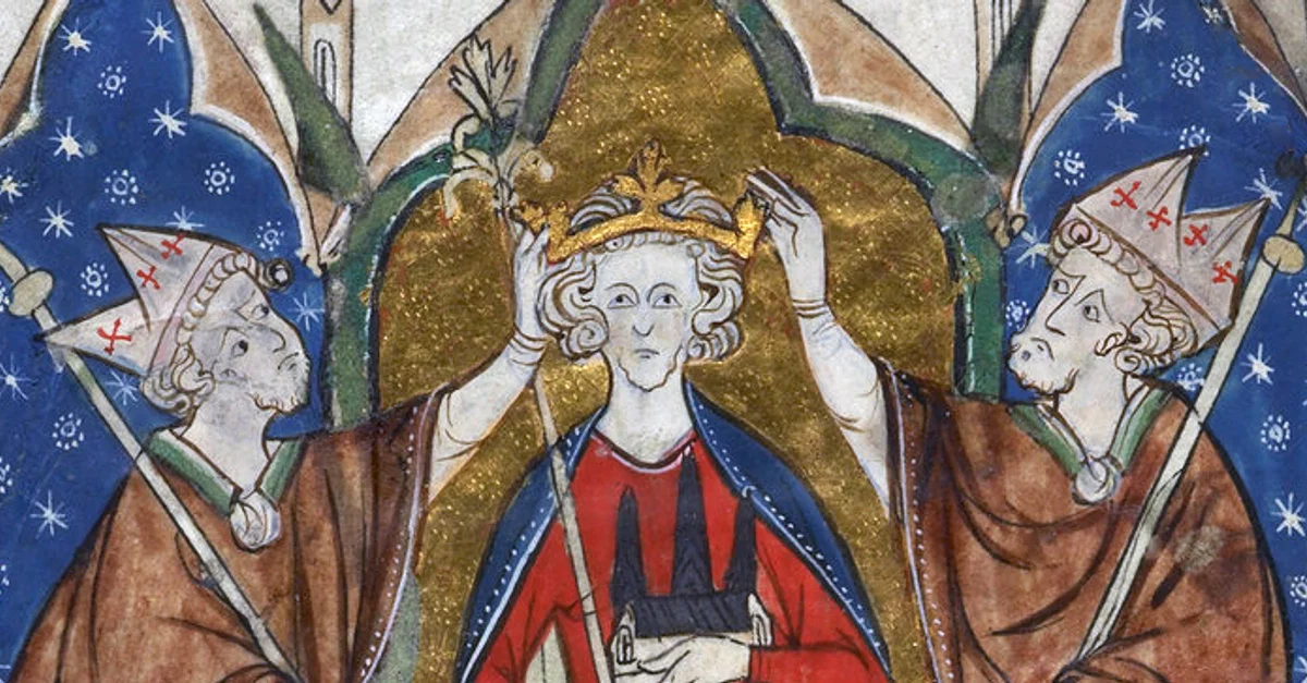 A medieval manuscript illustration showing the coronation of Henry III of England (1216-1272 CE)