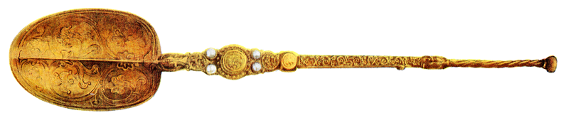 The Coronation Spoon of the British Crown Jewels. The spoon is the only object in the regalia which survives from the 12th century CE. The gold spoon is used for anointing the sovereign during their coronation ceremony. It measures 26.7 cm (10.5 inches) in length. The Crown Jewels are held in the Tower of London. (Image from G. Younghusband & C. Davenport, 'The Crown Jewels of England', London: Cassell & Co, 1919 CE).