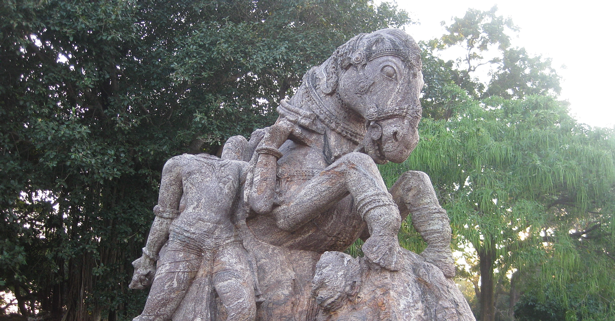 This is a sculpture found in the temple of Konarak, Odisha state, India. It shows a warrior standing alongside a warhorse. Now headless, he sports a scabbard down his back, while a quiver full of arrows is seen tied to the saddle. The horse is seen crushing one figure holding a sword under his hoofs, while another lies below his body. The horse is richly caparisoned with intricately carved details. The Konark Sun Temple was built in the 13th century CE (around 1250 CE) by King Narasimhadeva I (1238 – 1264 CE) of the Eastern Ganga dynasty (8th century CE - 15th century CE).