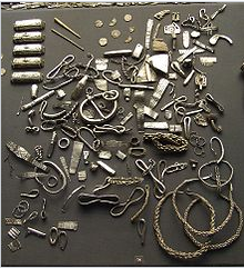 The Cuerdale Hoard is one of the largest found Viking hordes containing over 8,000 pieces of Viking jewelry, bullion, and coins. It was discovered 15 May 1840 CE in the Ribble Valley, a once bustling route for Vikings travelling between the Irish Sea and Viking York. The treasures, estimated to have been buried between 905-910 CE, date from after the Viking expulsion from Dublin in 902 CE. The majority of the hoard is housed in the British Museum in London, although the Ashmolean Museum in Oxford and the Château-musée de Boulogne-sur-Mer in France also hold some items from the hoard. The objects depicted are from the British Museum.