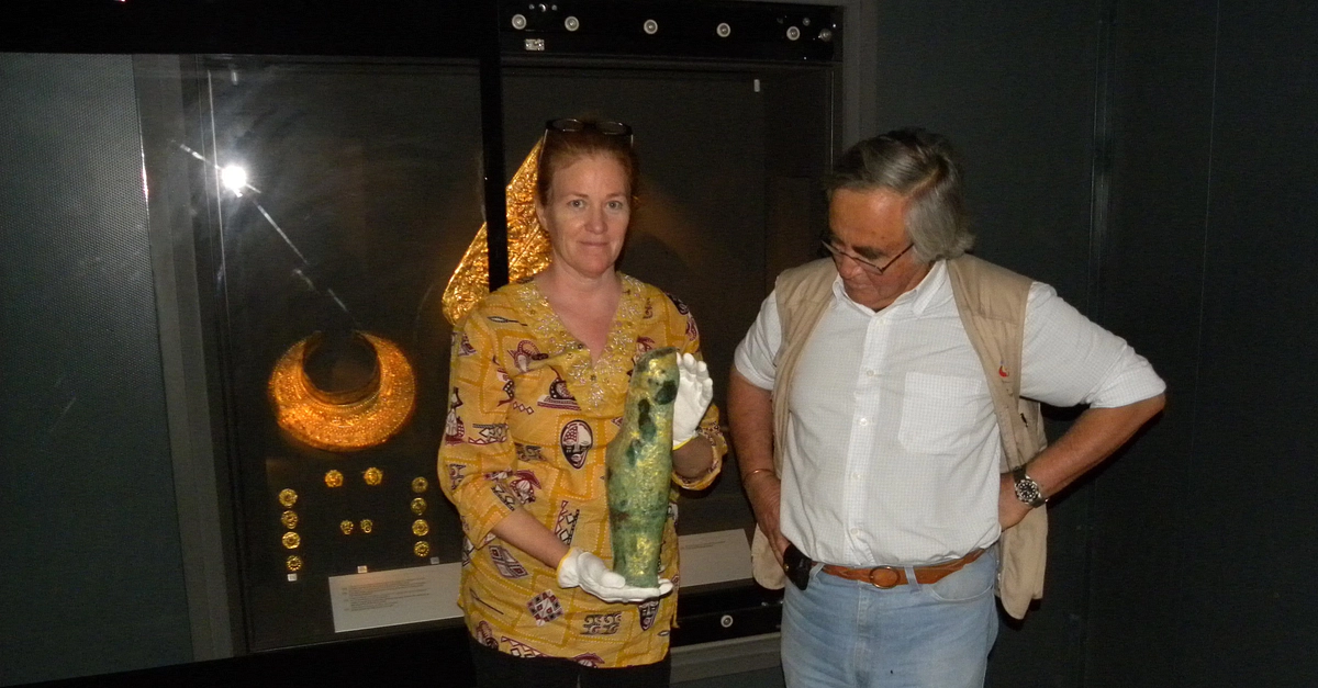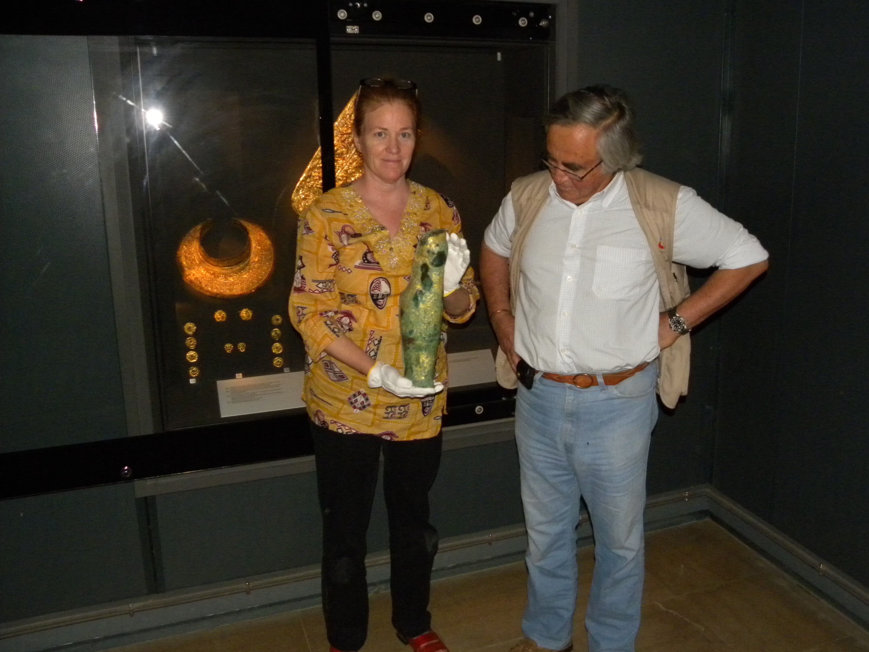 Professor Theodore Antikas with Laura-Wynn Antikas holding the shorter greave from the Royal Tomb of Vergina in front of the display cabinet in the Archaeological Museum of Vergina. Courtesy of the Antikas team archive.