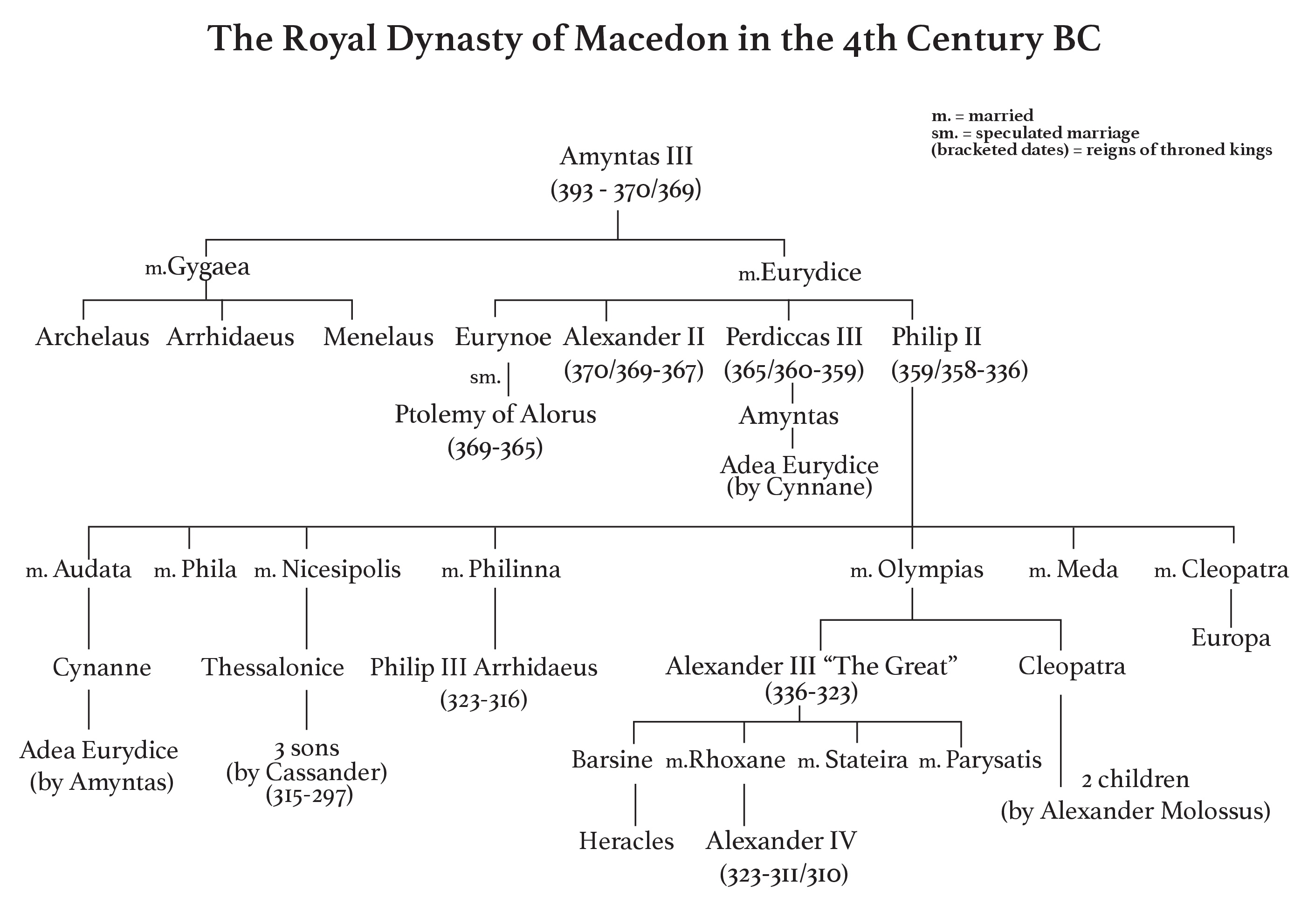 Family tree of the Royal Dynasty of Macedon in the 4th Century BCE. From Unearthing the Family of Alexander the Great. Grant (2019) p76. Used with permission from Pen & Sword Books.
