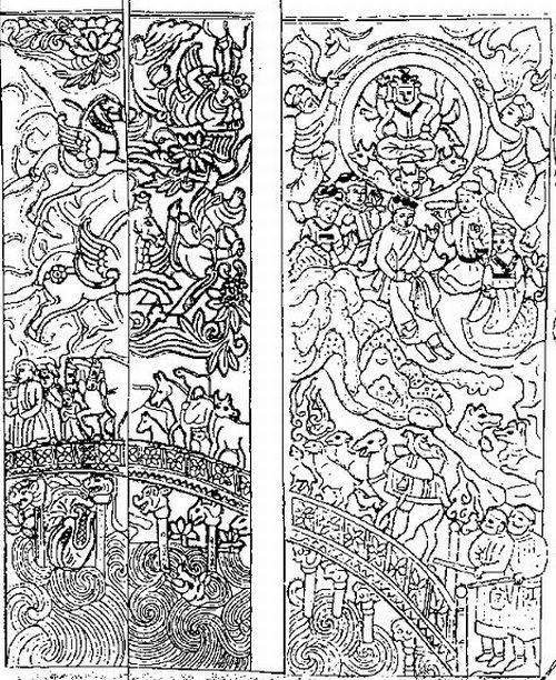 Line drawing of the eastern wall of the Sogdian sa-pao Wirkak’s sarcophagus (c. 580 CE) in Hsi-an: Wirkak and his wife are on their way over the Chinvat Bridge to the afterlife.