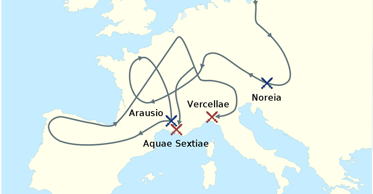 Map showing the route taken by the Cimbri and Teutones (2nd century BCE).