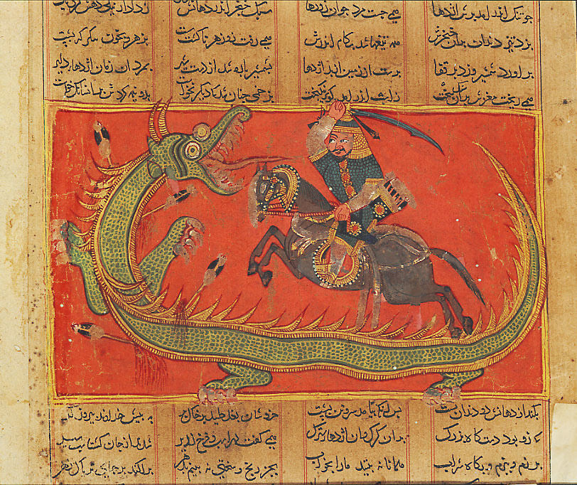 Garshasp kills the dragon, illustration from the Shahnameh, Sultanate of Delhi, c. 1450.