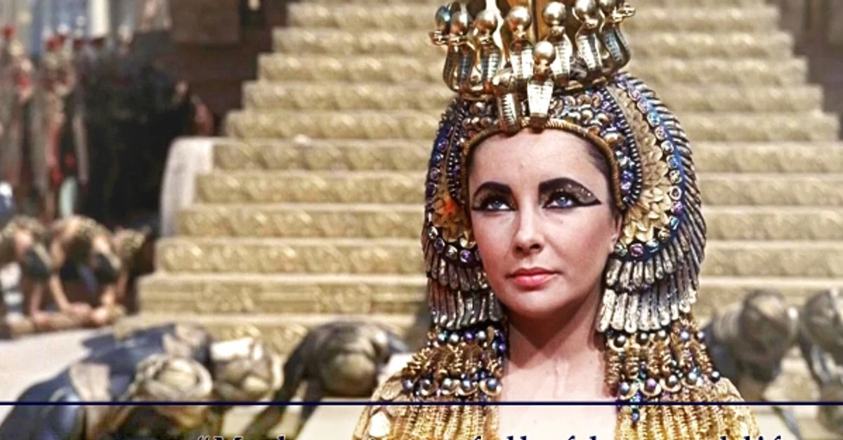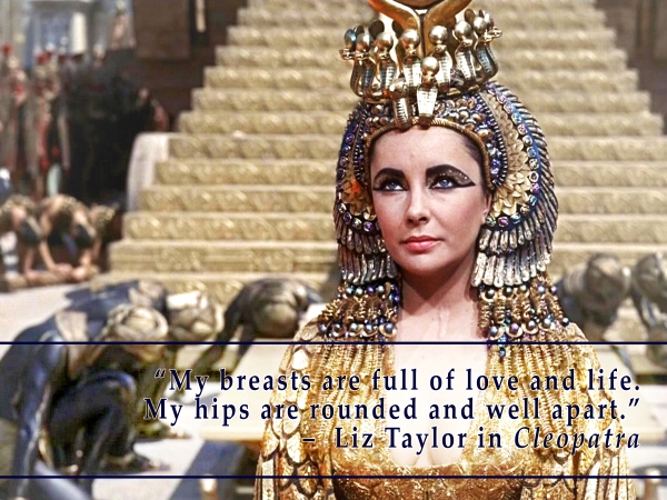 The iconic cinematic performance of Elizabeth Taylor in the motion picture Cleopatra (1963) left a lasting impression of the Egyptian queen’s supposed beauty. Despite its emphatic opulence, the movie still implies that Cleopatra could only maintain her relationships with Caesar and Antony due to her physical appearance. Still of Elizabeth Taylor in Cleopatra, dir. by Joseph L. Mankiewicz (20th Century Fox, 1963): “My breasts are full of love and life. My hips are rounded and well apart.”