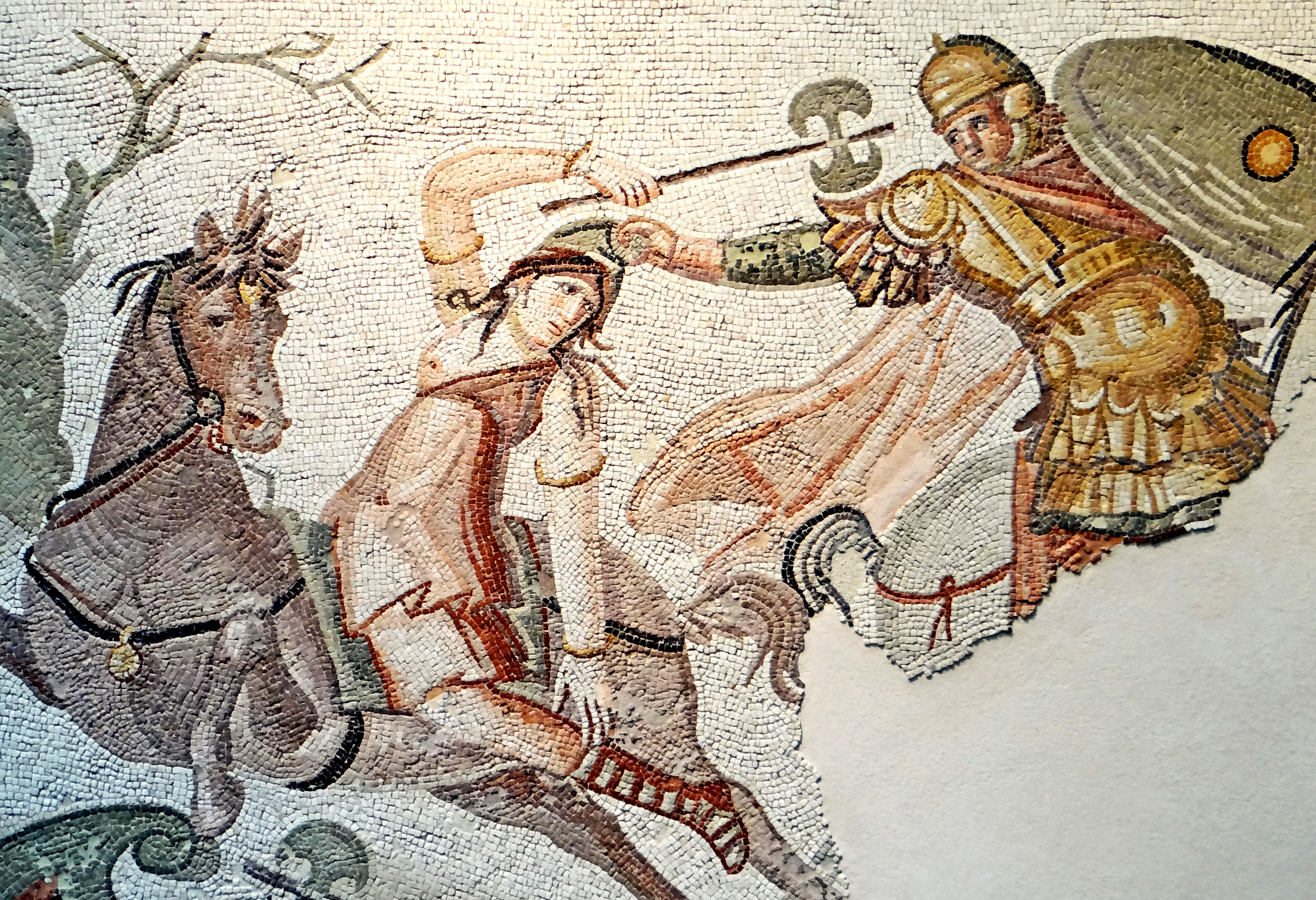 An ancient Roman mosaic from the 4th century CE depicting an Amazon warrior in mounted combat against a Greek rider. The Greek is seizing the Phrygian cap of the Amazon. Cropped detail of a mosaic from Daphne, a suburb of Antioch on the Orontes (modern Antakya, Turkey), now on display in the Denon Wing of the Louvre Museum.