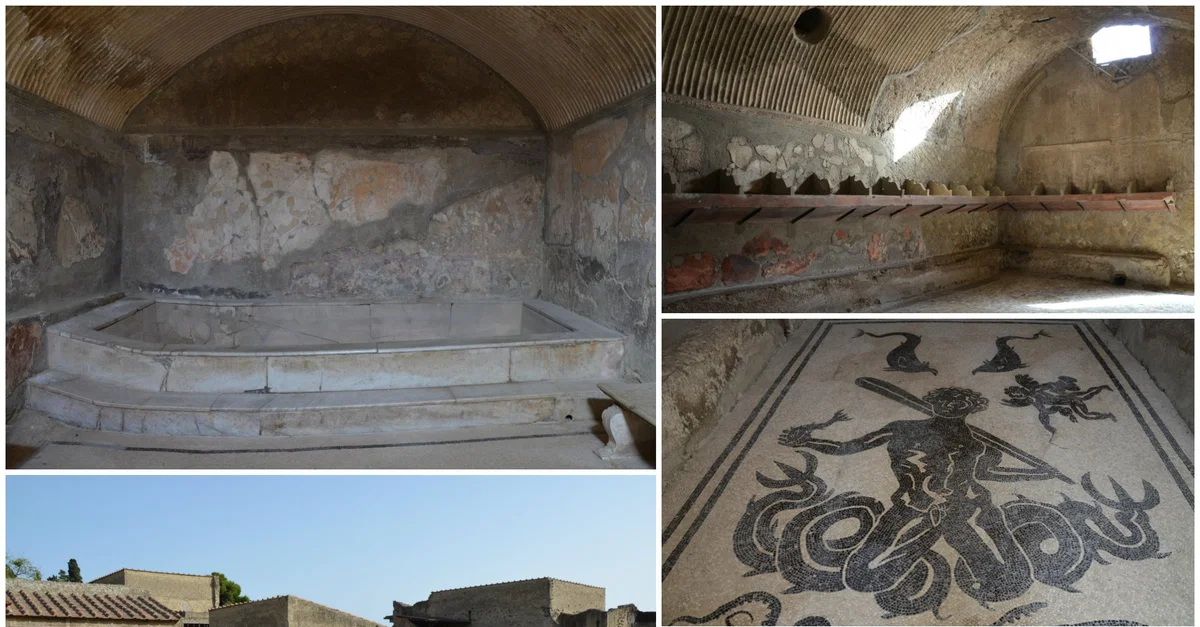 The Central Baths at Herculaneum were laid out around the beginning of the 1st century CE and were divided into separate (larger) men's and (smaller) women facilities, each with their sequence of changing room (apodyterium), warm room (tepidarium) and hot room (caldarium).