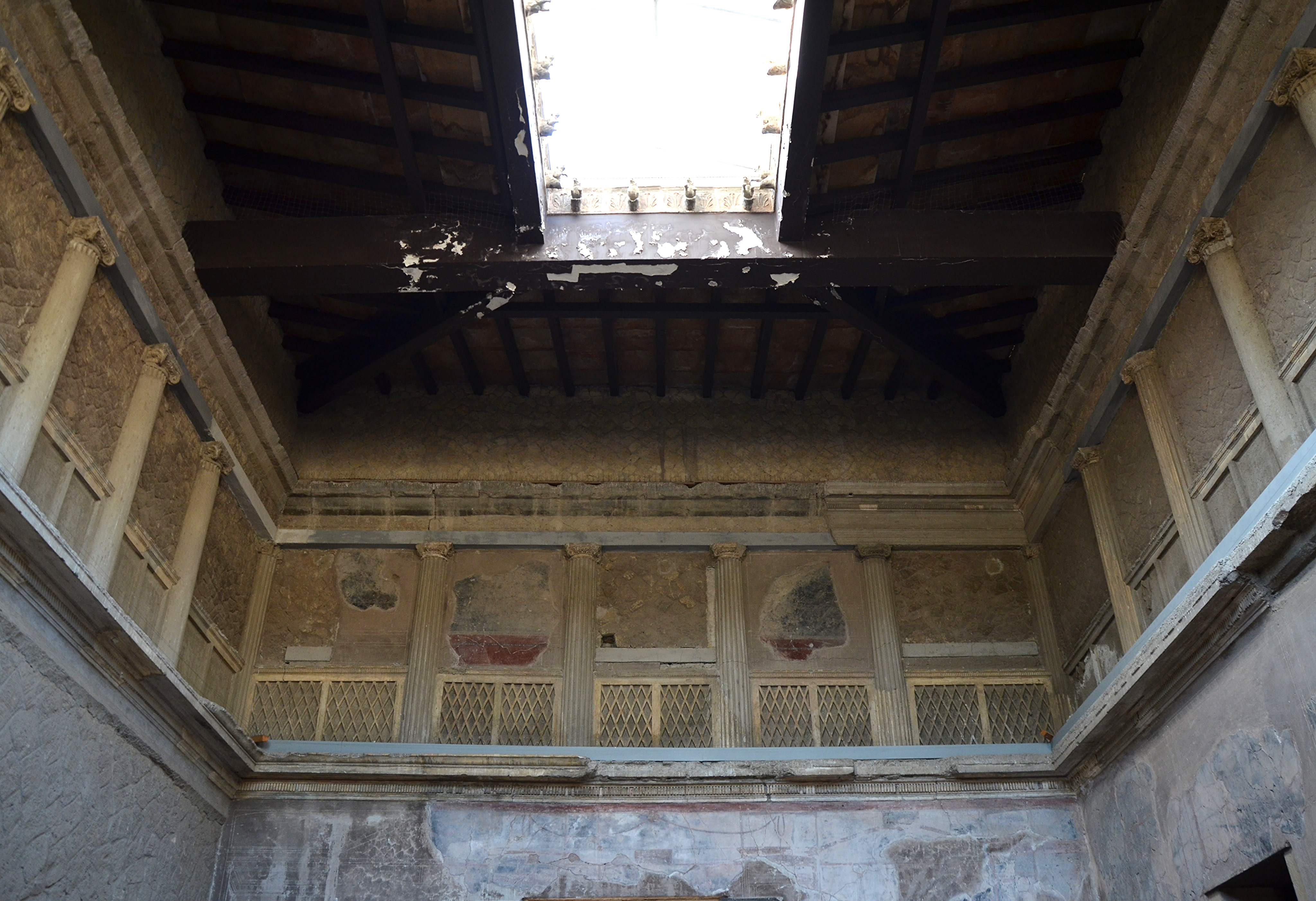 The atrium of the Samnite House in Herculaneum has a gallery with Ionic columns and latticework fences made of stucco on three sides. The house, which dates from the 2nd century BCE, is one of the oldest buildings so far discovered in Herculaneum.