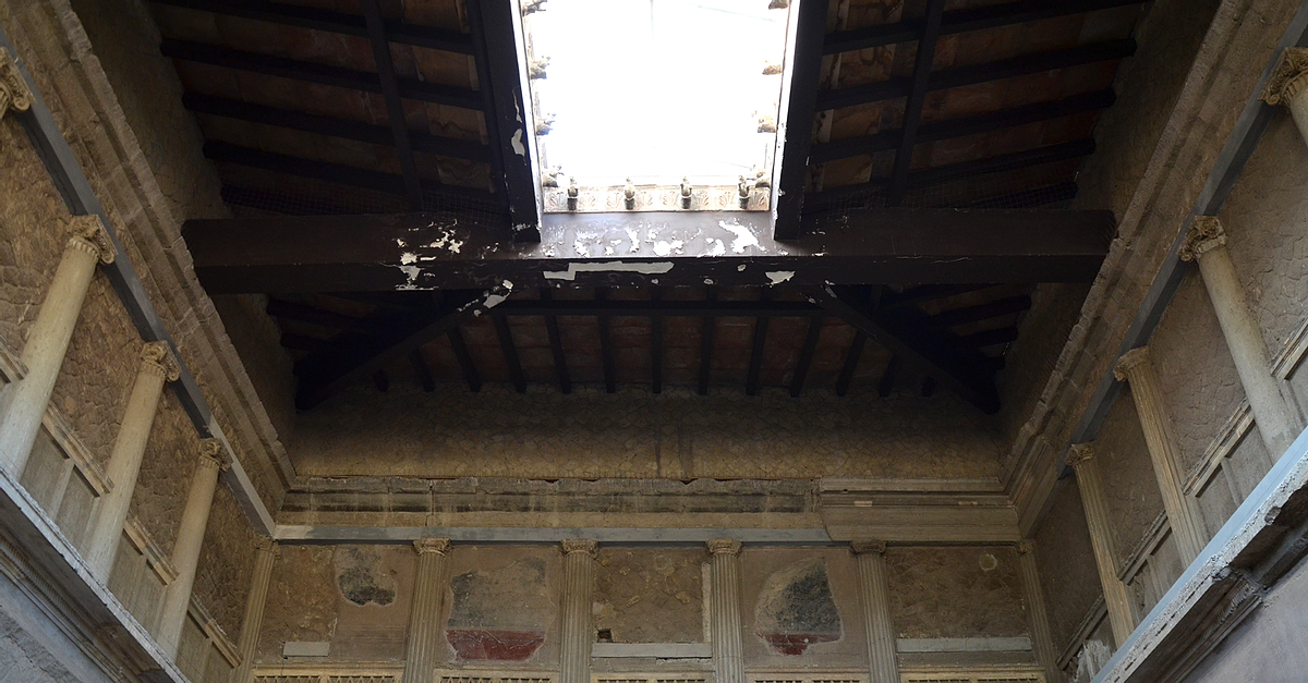 The atrium of the Samnite House in Herculaneum has a gallery with Ionic columns and latticework fences made of stucco on three sides. The house, which dates from the 2nd century BCE, is one of the oldest buildings so far discovered in Herculaneum.