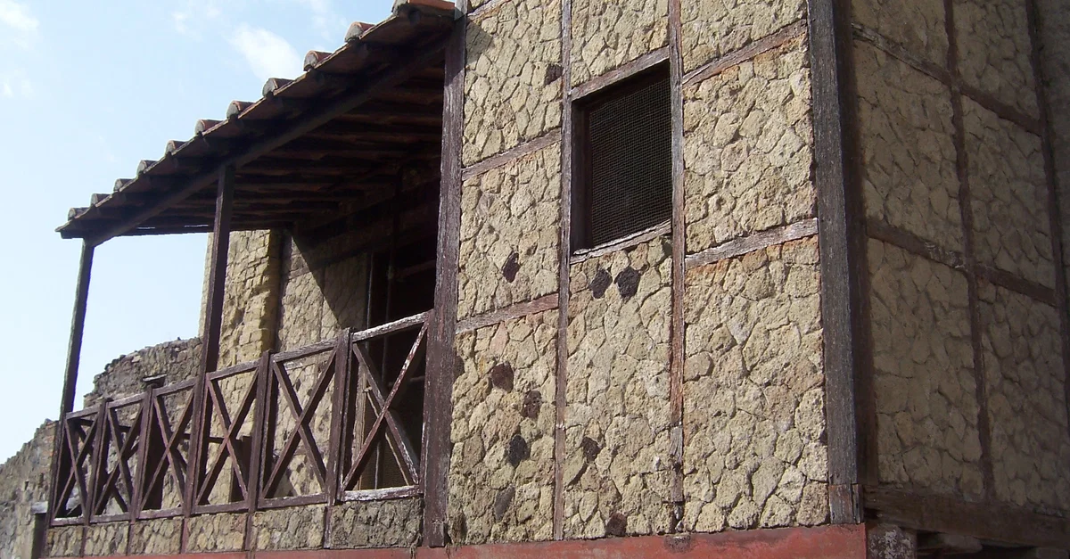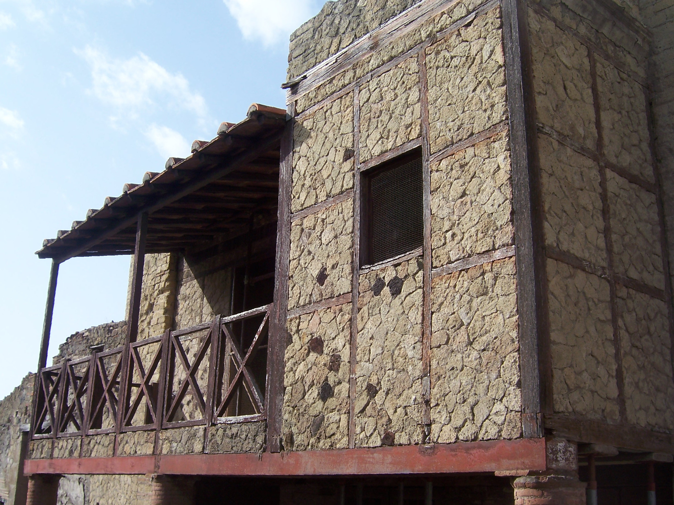 The Trellis House in Herculaneum was built almost entirely of opus craticium, a low-cost building technique with square wooden frames filled with crushed rocks called opus incertum. The upper floor of this house was intended for use by several families. It had a balcony supported by brick columns.