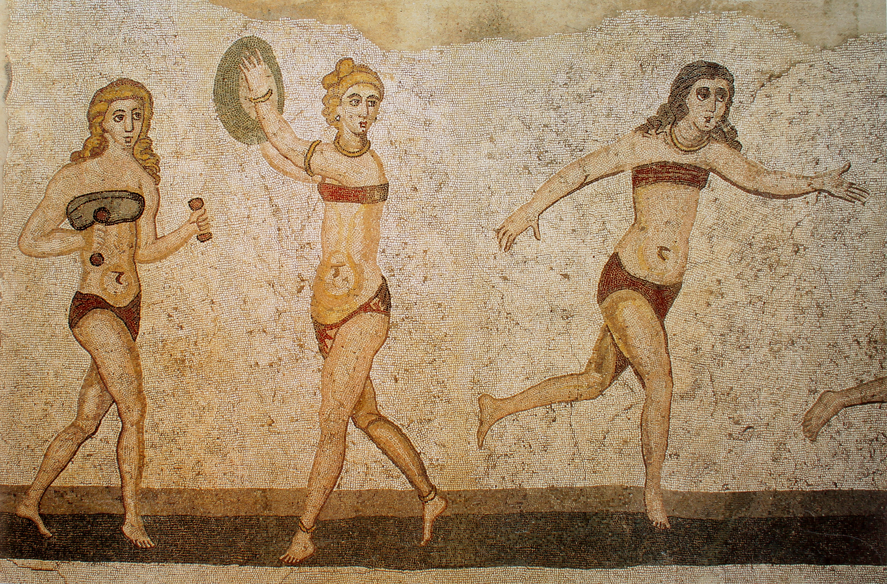 Detail of the "Bikini Mosaic" in the Villa Romana del Casale in Pompeii (Italy), depicting Roman girls exercising. 4th century CE.