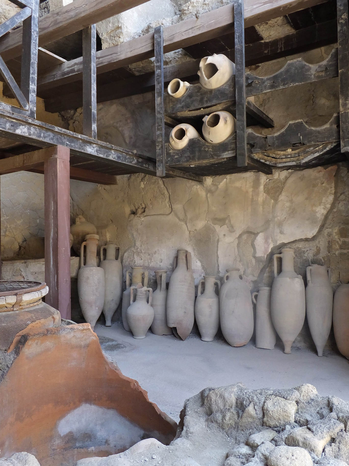 A shop attached to the House of Neptune and Amphitrite in Herculaneum where amphorae are stored on wooden racks and on the floor beside the shop's cooking area. This is one of the best-preserved shops in Herculaneum.