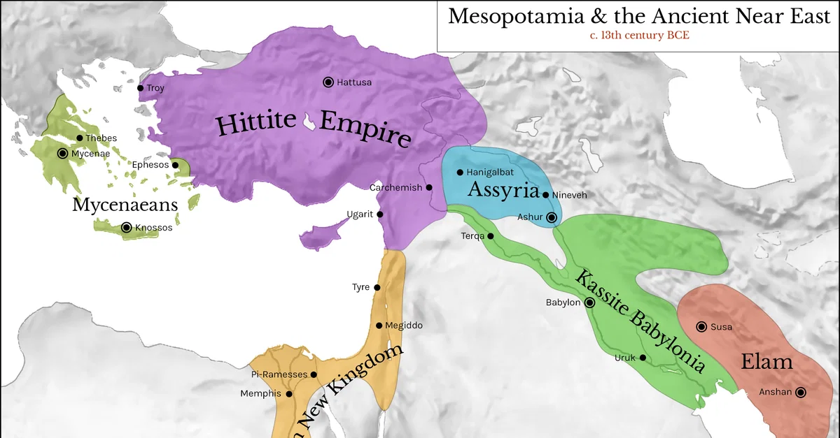 Map of Mesopotamia and the Ancient Near East c. 1300 BCE, showing the period of Great Powers, with the six large kingdoms and empires (the Hittites, the Mycenaean Civilization, Assyria, Babylonia, Elam and the New Kingdom of Egypt) co-existing in relative stability. This is the period of diplomacy with has produced the Amarna Letters and the Treaty of Kadesh, the first recorded peace treaty in history.
