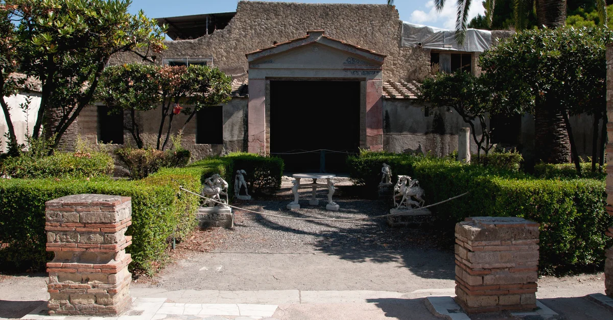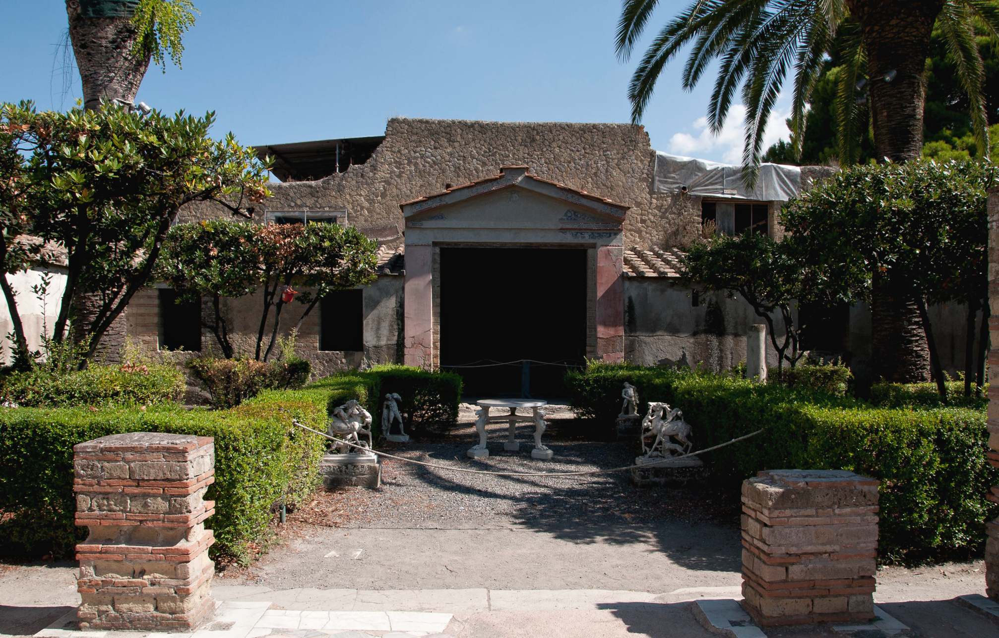 View of the terrace garden of the House of the Deer in Herculaneum which commanded magnificent views over the Bay of Naples. It has copies of marble statues which originals were found in the garden: two of a deer being attacked by dogs, one of a Satyr with a Wineskin and another of one of a Drunken Hercules.