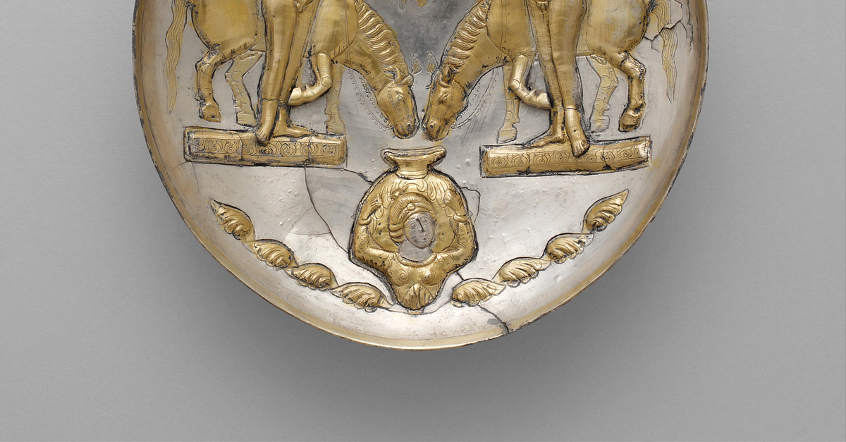 This gilded silver Sasanian plate features an unusual scene that borrows from Graeco-Roman prototypes and possibly Iranian ones as well. Two youths stand on platforms facing one another, each holding a staff and the reins of a winged horse, reminiscent of representations of the hero Bellerophon and Pegasus as well as of the Dioskouroi (the divine twins Castor and Pollux). Both horses bend their necks down to drink from a large vessel supported by a female figure, who appears in bust form emerging from a frieze of half-palmettes. She is most likely either a personification of water or the Iranian river goddess Anahita.