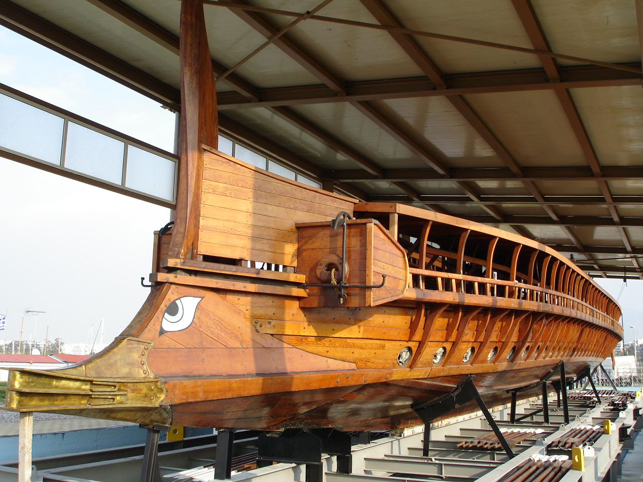 The hull of the Olympias, a full-scale reconstruction of an ancient Greek trireme warship. The principal strategy in battle of the trireme was to sink or damage the oars of an enemy vessel using the bronze ram fixed to the ship's prow. Triremes were used throughout antiquity and used most famously in the Battle of Salamis in 480 BCE when the allied Greek fleet defeated that of Persian king Xerxes.