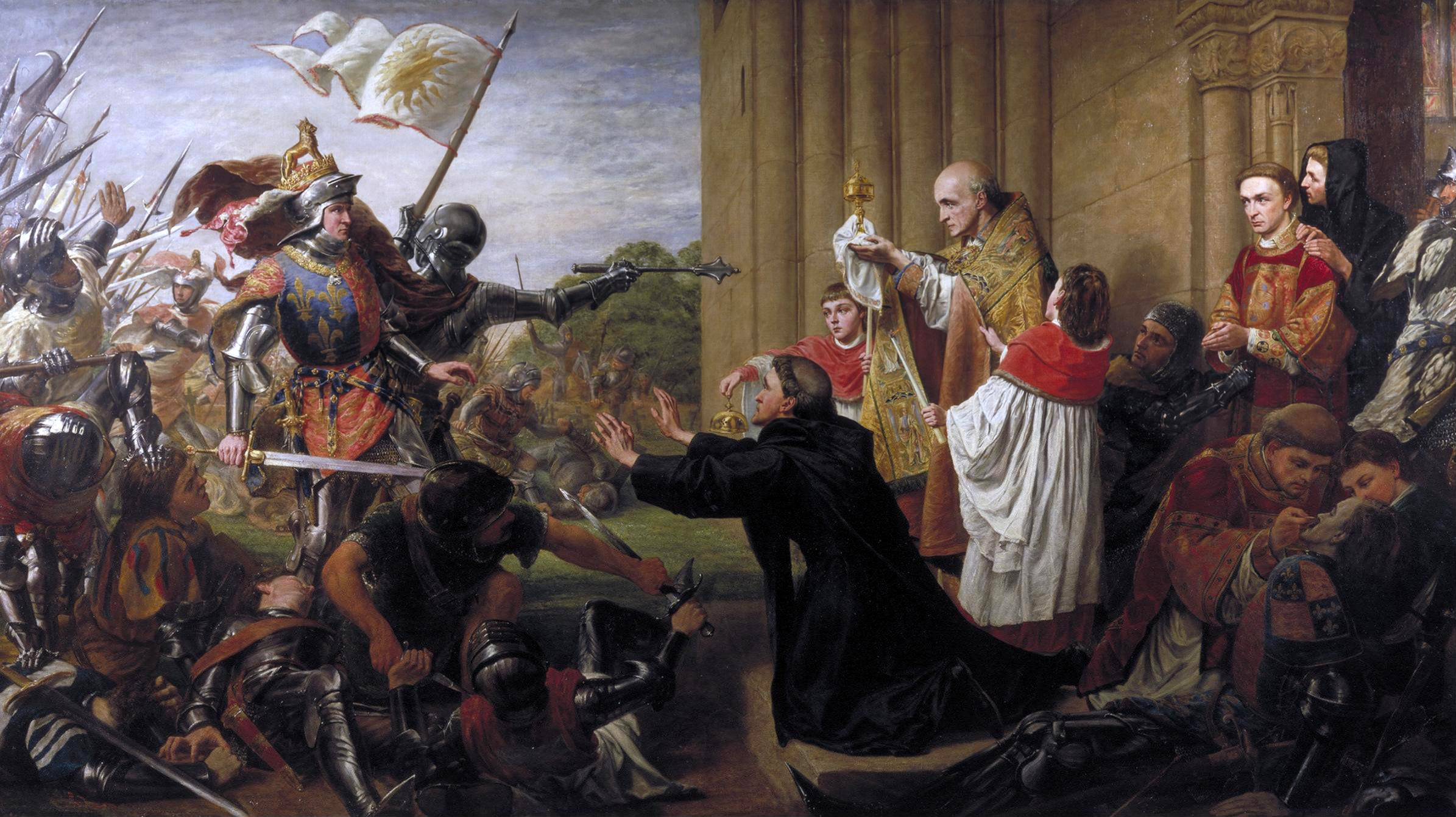 "Edward IV and Lancastrian Fugitives at Tewkesbury Abbey" (aka "Sanctuary") by Richard Burchett (1815 - 1875 CE). The painting depicts Edward IV of England (r. 1461 to 1470 CE, 1471 - 1483 CE) pursuing Lancaster forces after the conclusion of the Battle of Tewkesbury in 1471 CE. Oil on canvas, 1867 CE. 154.9 cm (61 in) x 274.3 cm (108 in). From the Guildhall Art Gallery, London. (Image has been digitally retouched)