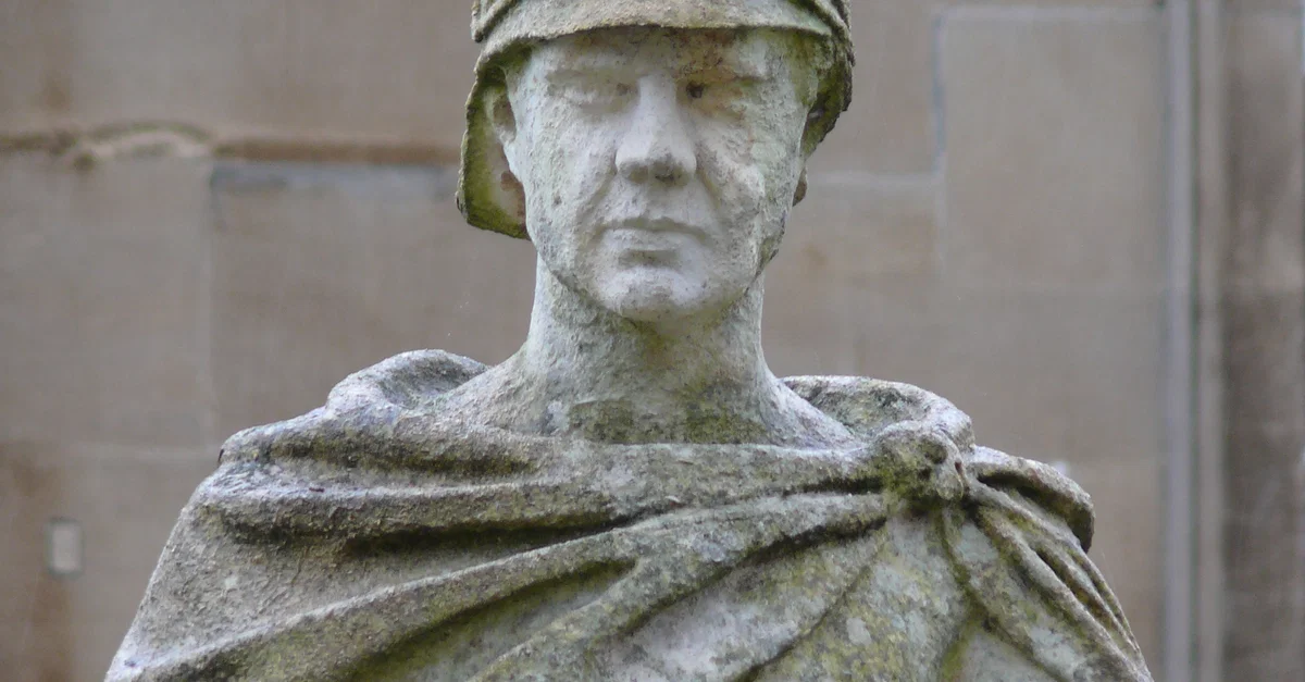 Statue of Gaius Suetonius Paulinus on the terrace of the Roman Baths (Bath). The terrace is lined with statues of Roman governors of Britain, Roman emperors and military leaders. The statues date to 1894 CE.