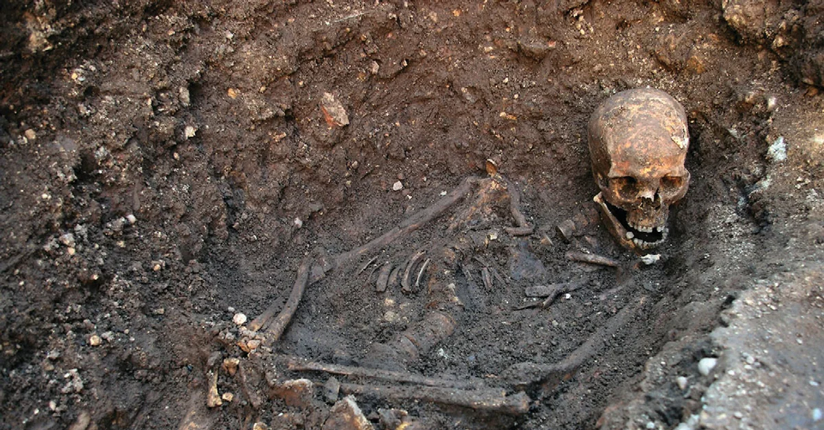 The skeleton identified by researchers from the University of Leicester as that of Richard III of England (r. 1483-1485 CE). The skeleton was excavated from the ruins of Greyfriars Abbey, then beneath a car park in Leicester in 2012 CE. (Image accredited to Richard Buckley, Mathew Morris, Jo Appleby, Turi King, Deirdre O'Sullivan, and Lin Foxhall)