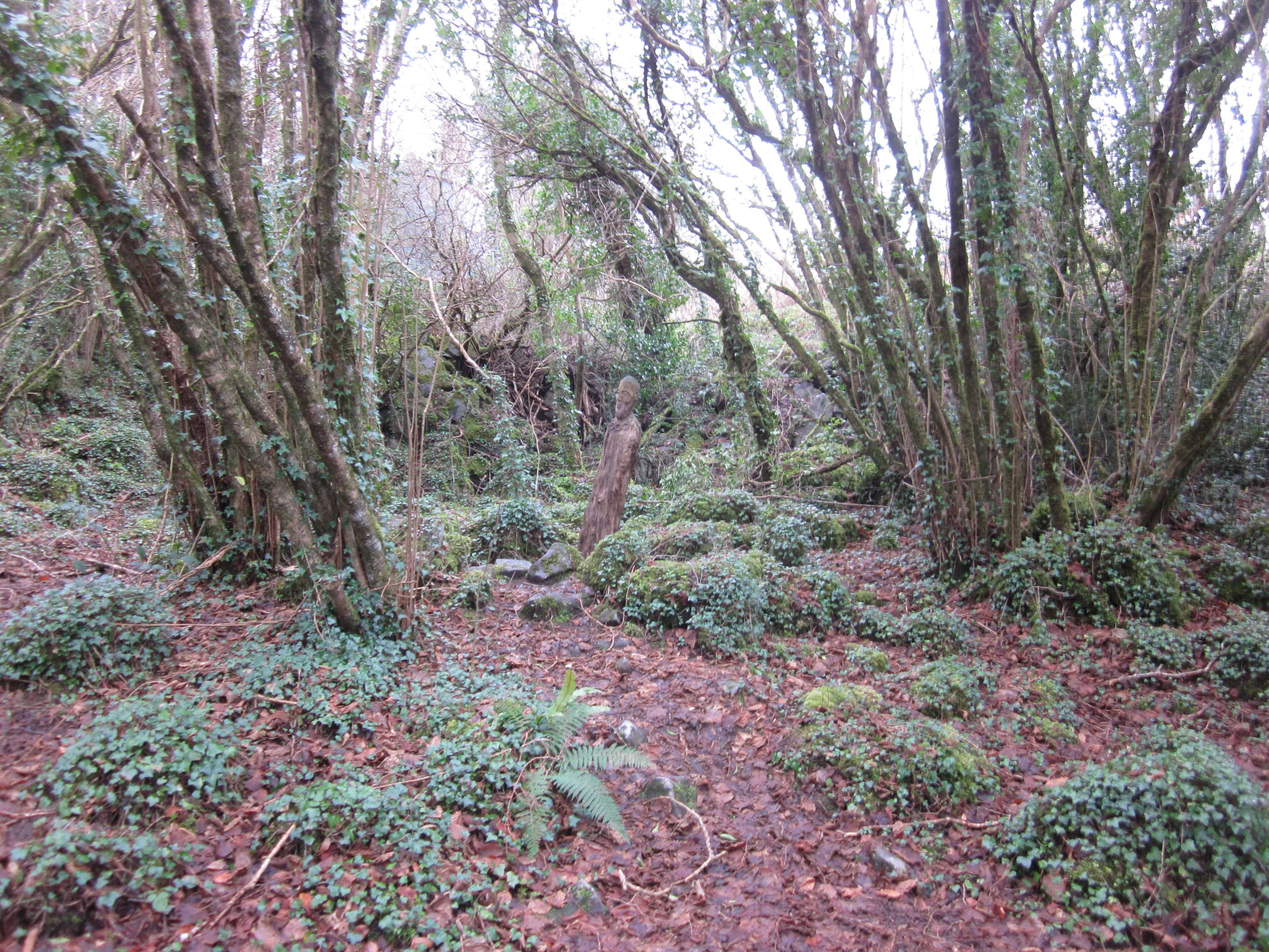 One of the many wooden figures and other objects depicting Celtic figures or motifs in the woods surrounding Ailwee Caves, County Clare, Ireland.