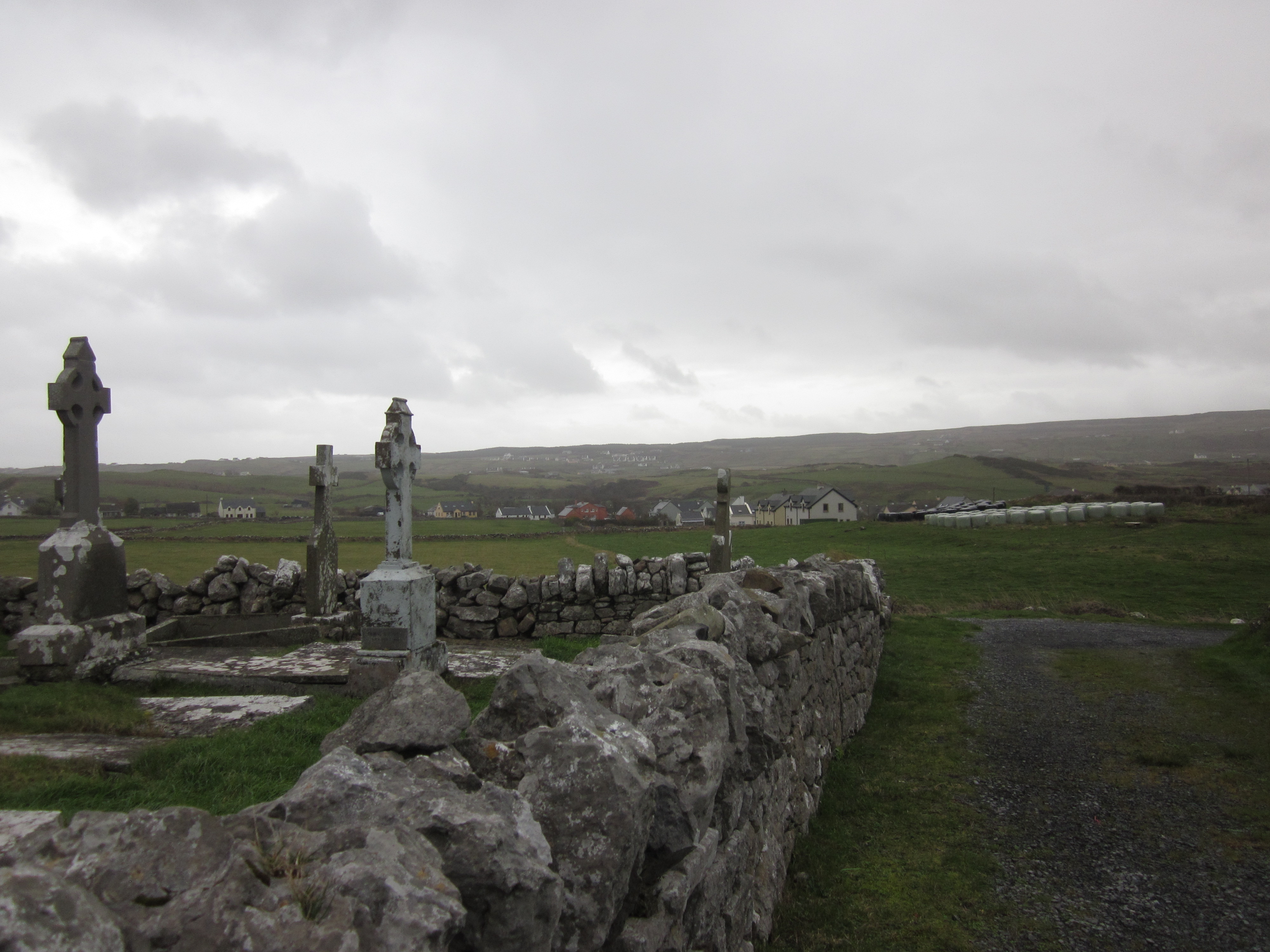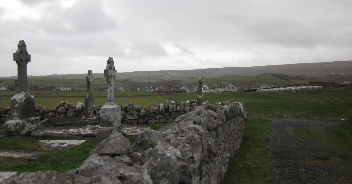 The village of Doolin, County Clare, Ireland. Seen from the graveyard surrounding the ruins of the 1470 CE Killilagh Church. The graveyard is still in use and is tended by the people of the village who also maintain the church ruins.