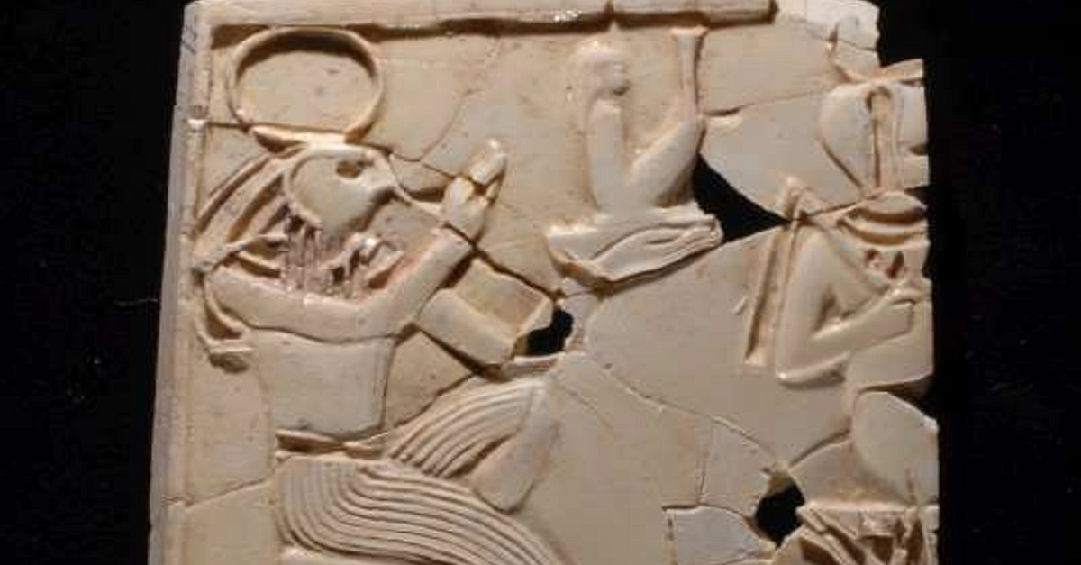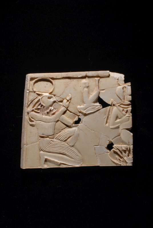 Furniture inlay depicting the Egyptian gods Re (Ra) and Horus the child, found in Samaria. Ivory, 9th to 8th century BCE. Israel Antiquities Authority. Copyright, republished with permission.