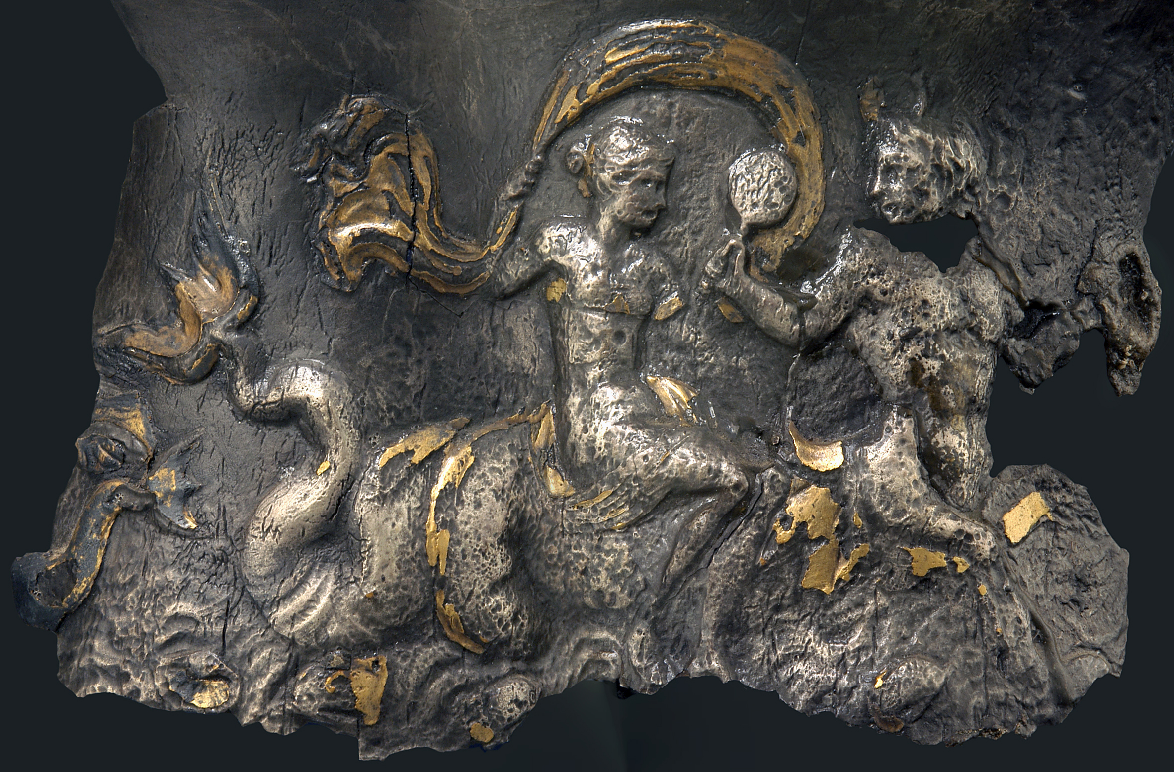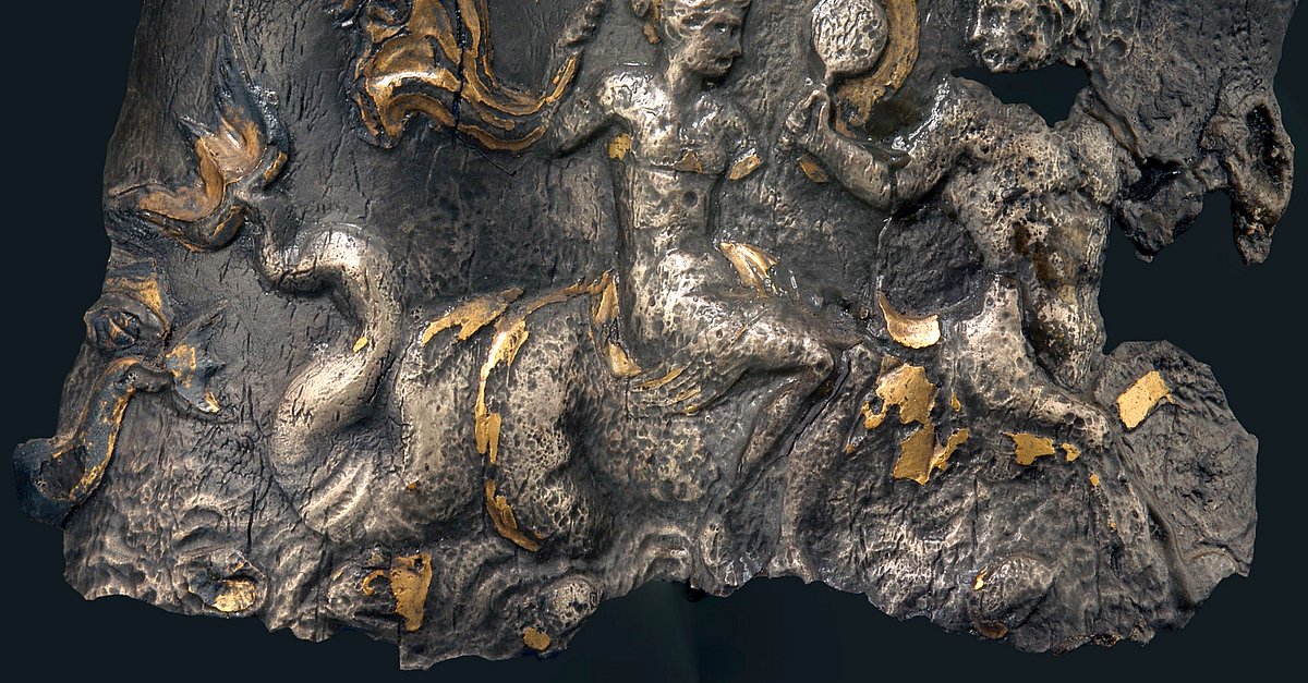A fragment of a gilded silver wine jug from southern Spain (10.5 cm in height; ca. 1st cent. BCE; APM inv. no. 15.375). The image is “rolled” out to compensate for the curvature of the vase neck. The scene illustrates a Nereid riding on the back of a sea centaur. Image courtesy of the Allard Pierson Museum, Amsterdam.