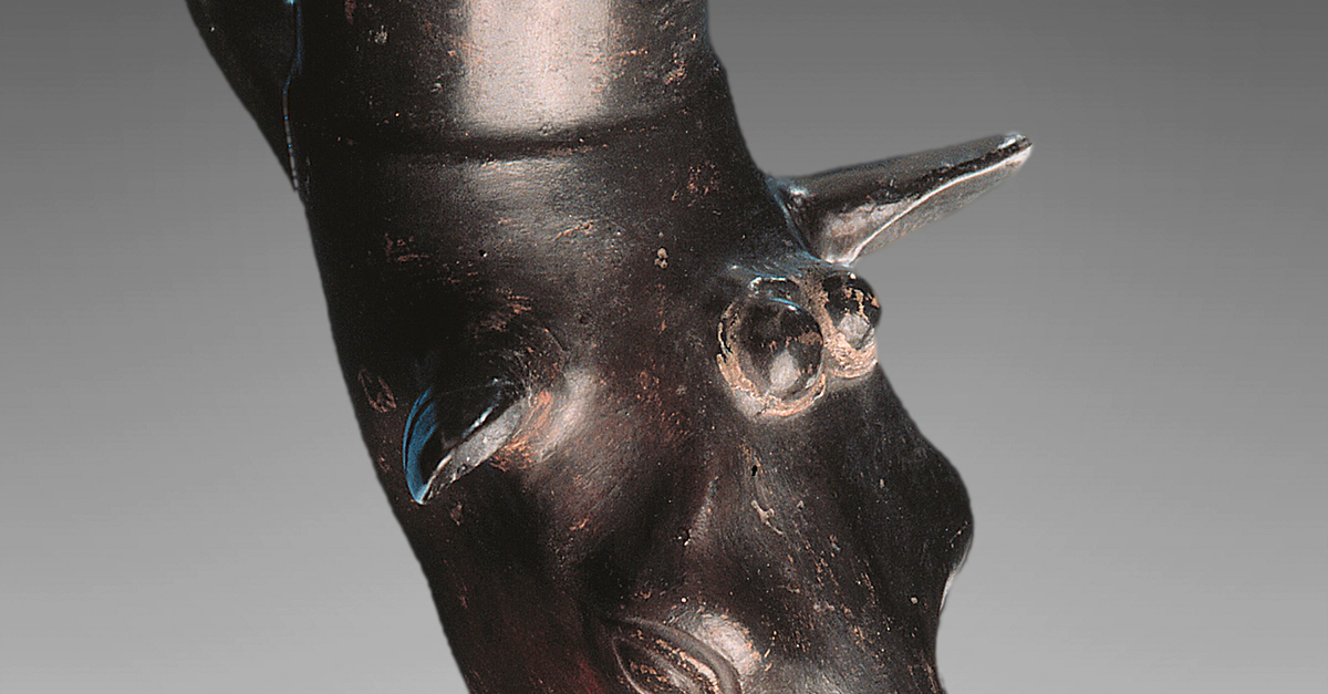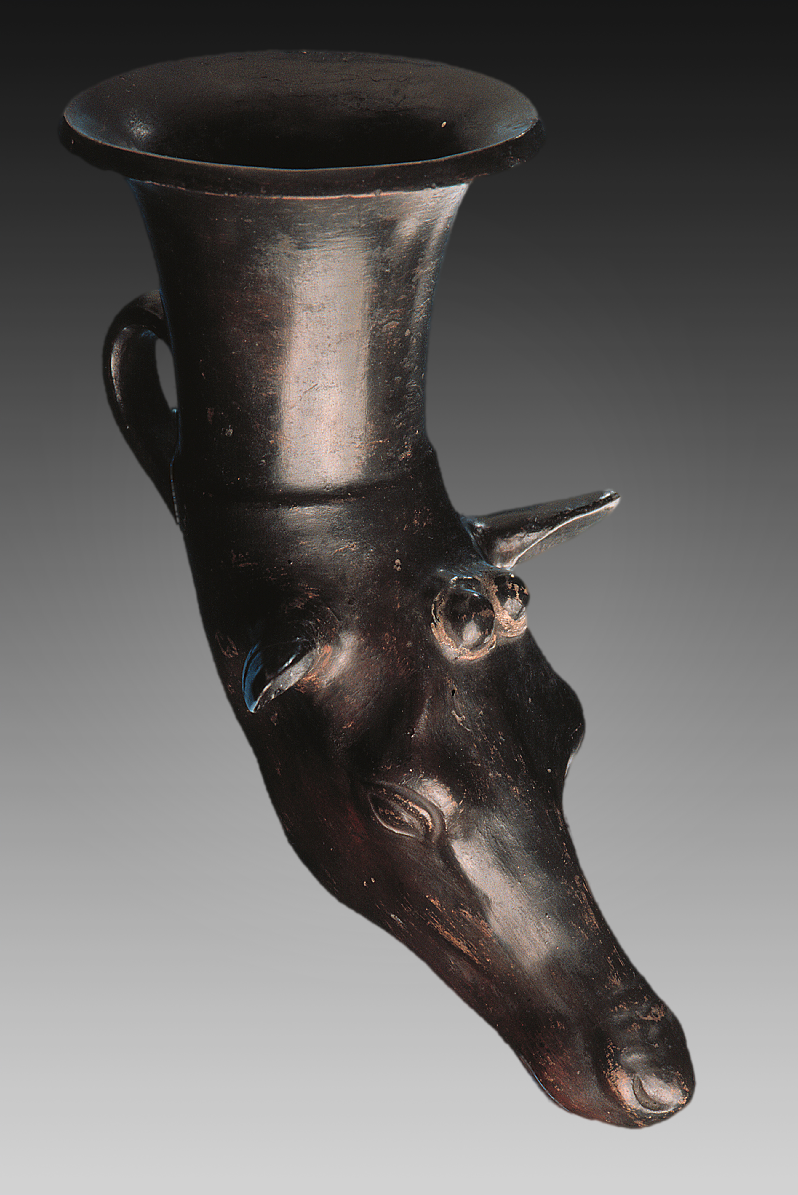 The ancient Persian tradition of drinking or pouring wine from rhyta (drinking horns) was eagerly adopted in Classical Greece – despite the great political enmity between Greece and Persia. In the Hellenistic Age, rhyta in different materials remained popular. This example from Campania terminates in a highly naturalistic head of a roe deer (19.5 cm in length; ca. 3rd cent. BCE; APM inv. no. 787). Image courtesy of the Allard Pierson Museum, Amsterdam.